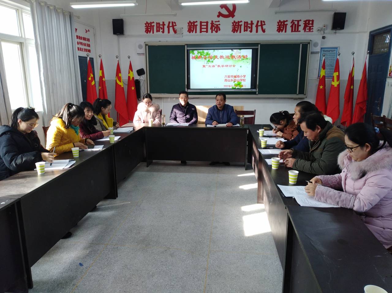 12月19日下午,雪后初晴,暖阳高照。城南小学赵宗玲老师在校长傅永章、青山乡中心学校聂永副校长等带领下,来到青山学校,开展送教下乡活动。本次送教,对象是全乡五年级语文老师。
