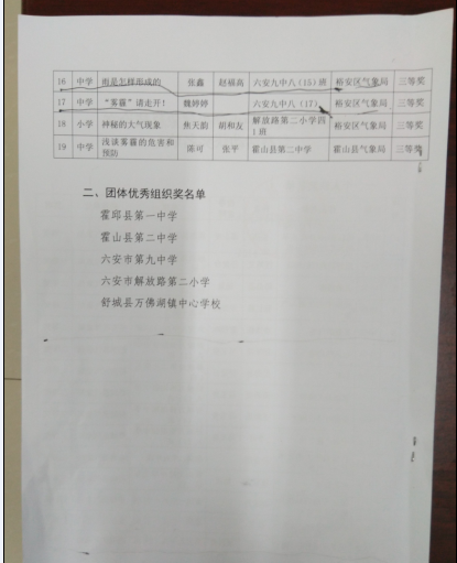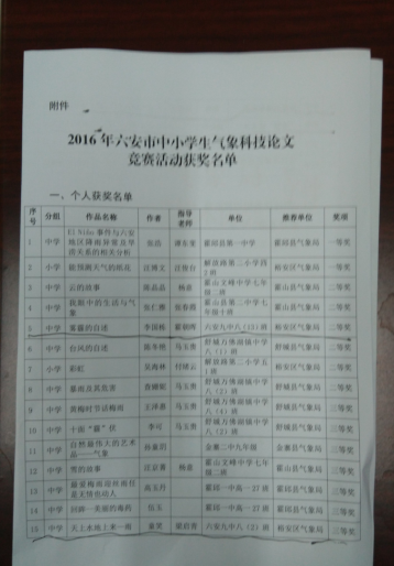 在“2016年六安市中小学生气象科技论文竞赛”中,六安九中荣获团体优秀组织奖,八13班李国栋荣获市二等奖,八2班童笑、八15班张鑫、八17班魏婷婷荣获市三等奖。