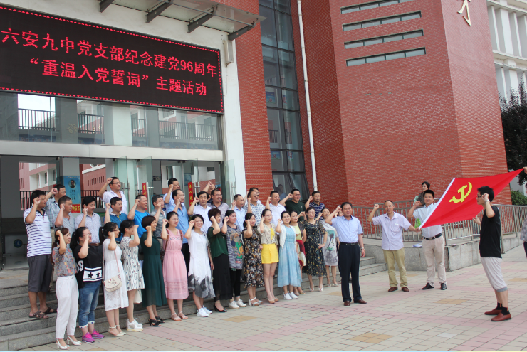 为庆祝中国共产党建党96周年,进一步推进“两学一做”学习教育暨“讲政治、重规矩、作表率”主题教育活动,增强广大党员党章意识、政治意识,坚定爱党、信党、跟党走的理想信念,7月1日上午,六安九中党支部在学校组织全体党员举行纪念建党96周年“重温入党誓词”活动。
