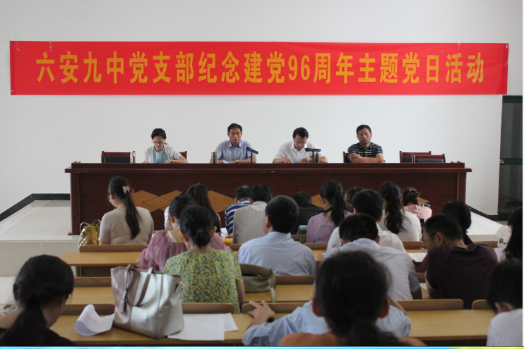 为深入推进“两学一做”学习教育常态化制度化和“讲政治、重规矩、作表率”专题教育,在中国共产党成立96周年之际,7月3日上午五楼报告厅,六安九中党支部组织全体党员开展迎“七一”主题党日活动。裕安区教育局党组成员、九中支部书记李胜校长以《平凡心、事业心、责任心》为主题为全体党员教职工作党课报告。