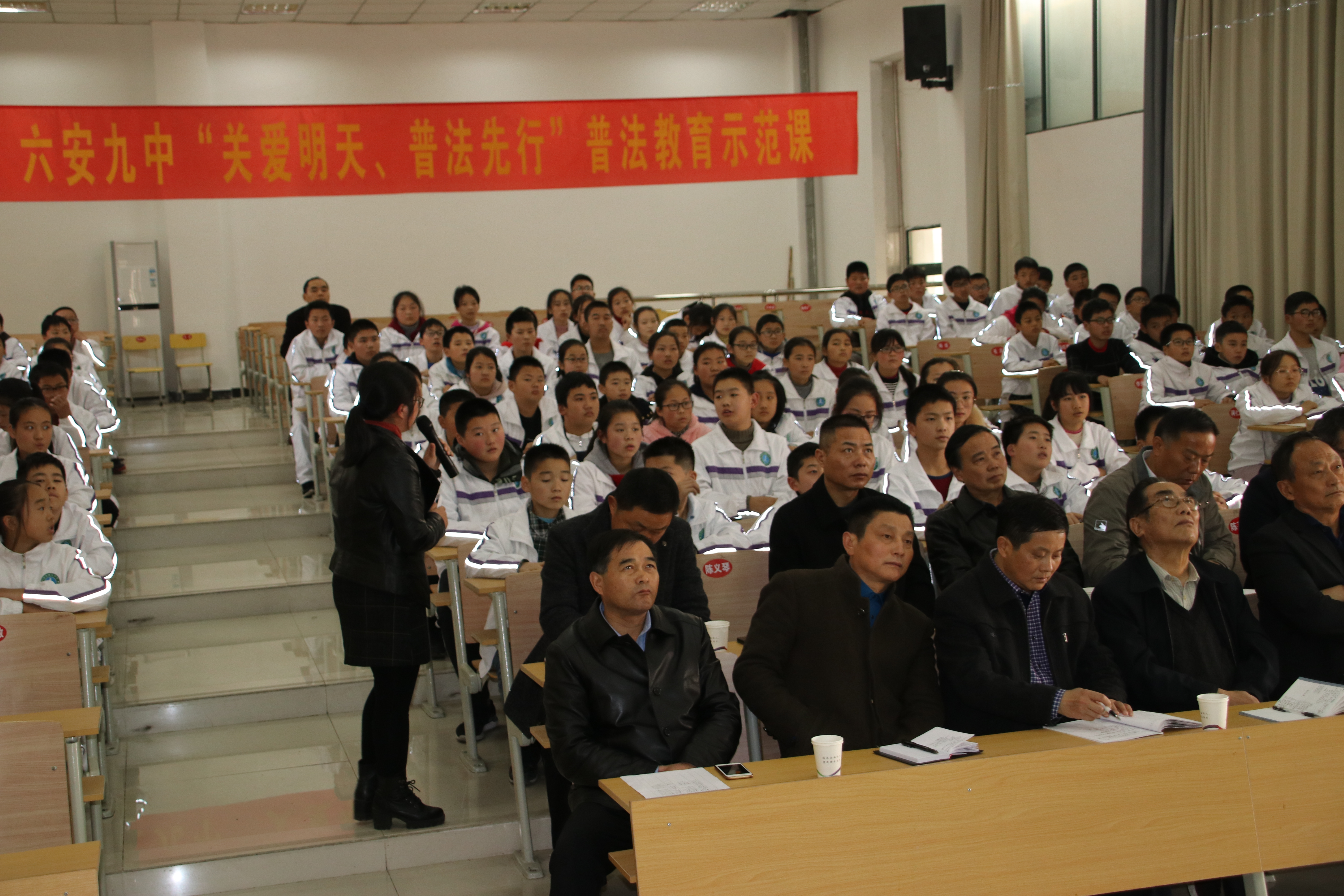 之后,进入课堂,听取了六安九中九中法治辅导员高靖老师主讲的法治教育示范课。