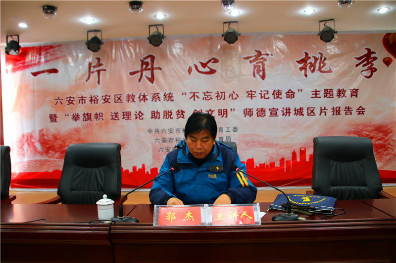 送理论 助脱贫 创文明”师德宣讲城区片报告会。裕安区委教育工委副书记、区教体局副局长郭杰,裕安区委教育工委委员、六安九中党总支书记李胜及城区部分学校教师近600人聆听了报告。报告会由六安九中执行校长李艳主持。