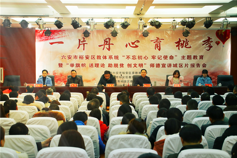 为贯彻落实十九届四中全会精神,加强教师职业道德建设,充分展示全区广大教师爱岗敬业、奋发进取的精神风貌,弘扬教师甘为人梯、乐于奉献的高尚情操,推动全区师德师风建设再上新台阶。11月30日下午,裕安区委教育工委、区教体局、区教育工会在六安九中举办裕安区教体系统“不忘初心、牢记使命”主题教育暨“举旗帜