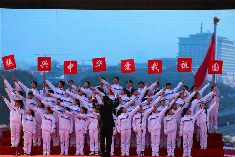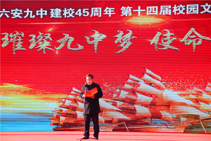 接着,张恩平局长为本次活动致辞。张局长在致辞中说,六安九中一年一届的校园文化节丰富了校园文化生活,提高了学生的综合素质和能力,加强了学生思想政治教育工作,培养了广大学生“自信、开放、创新”的意识,向社会各界展示出六安九中乐观积极、敢于拼搏、锐意进取的精神风貌。他还说,45年来,在一代代九中人的共同努力、奋力拼搏下,六安九中已经成为裕安区义务教育的一面旗帜。尤其是近年来,六安九中硬件设施得到极大改善,学校办学方向明确、定位准确,教育教学工作稳步推进,取得了骄人的成绩,实现了六安九中历史上的飞跃性发展。最后,他希望广大老师不忘教书育人的初心和使命,同心同德,再接再厉,把九中越办越好;希望九中学子勤奋学习、锐意进取、自强不息,做21世纪的建设者和接班人。
