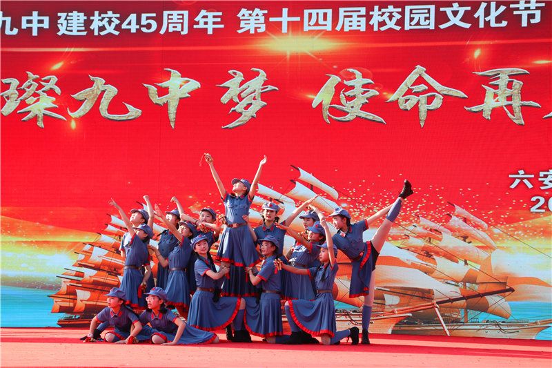 六安九中历来重视校园文化艺术节活动,每年学校领导积极筹划、精心准备。从文艺节目的选择、排练、筛选、审核到服装、道具、布景的配套都指定专人负责。大家互相配合、通力协作,有效地保证了校园文化艺术节的质量。同时,学校坚持“人人参与、班班动员”的原则,把每年的文化艺术节办成展示师生艺术风采、体现九中办学特色、增强学校凝聚力、向心力、影响力的窗口。通过一年一届的文化大餐、视听盛宴,使全体师生受到艺术的熏陶、心灵的净化、思想的洗礼。