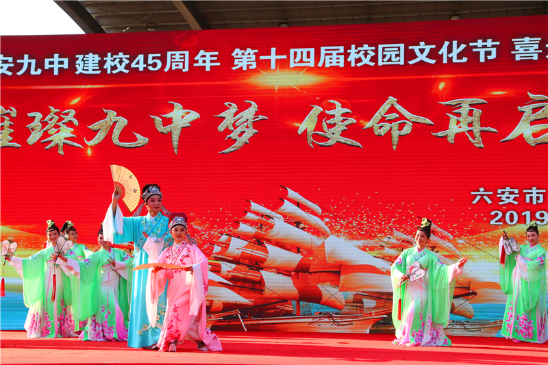 本届艺术节文艺汇演以“璀璨九中梦,使命再启航”为主题,形式新颖,各具特色,在开场舞《我的祖国》中拉开帷幕。17个各具特色的节目精彩纷呈,有优美的舞蹈、精彩的武术;有经典的庐剧选段、诗文诵读;有婉转的古筝合奏、动听的师生合唱……节目一个比一个精彩,赢得了现场观众的阵阵掌声。诗歌朗诵《九中赞歌》气势恢宏、振奋人心,老师们的深情朗诵,讲述六安九中45年发展历程和辉煌成就,将演出推向高潮。更值得一提的是,六安九中优秀毕业生、国家一级演员、合肥庐剧院院长段婷婷回到母校,倾情演绎庐剧经典剧目《梁祝》选段《十八里相送》,为母校献礼,为母校庆生。