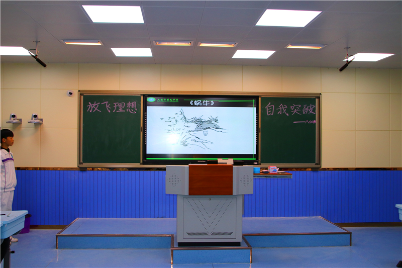 伴随着鼓舞人心的《隐形的翅膀》,这次“放飞理想,自我突破”的主题班会拉开了帷幕。一段相声表演《谈理想》,揭示了本次班会的主题。紧接着,小游戏《名言警句大比拼》,让同学们的理想飞遍了整个教室,印在了他们的心里;观看动画片《蜗牛》,大家畅谈理想;欣赏诗歌朗诵《理想》,坚定了同学们前进的步伐;齐唱《真心英雄》后,同学们大声说出理想,在理想板上勇敢地写出理想;一段小品《影子》,让同学们明白如果经不起身边的诱惑,理想最终会从心中走远;展示徐郭睿同学的“个人目标规划情况表”后,她向同学们分享了她的成功的经验。
