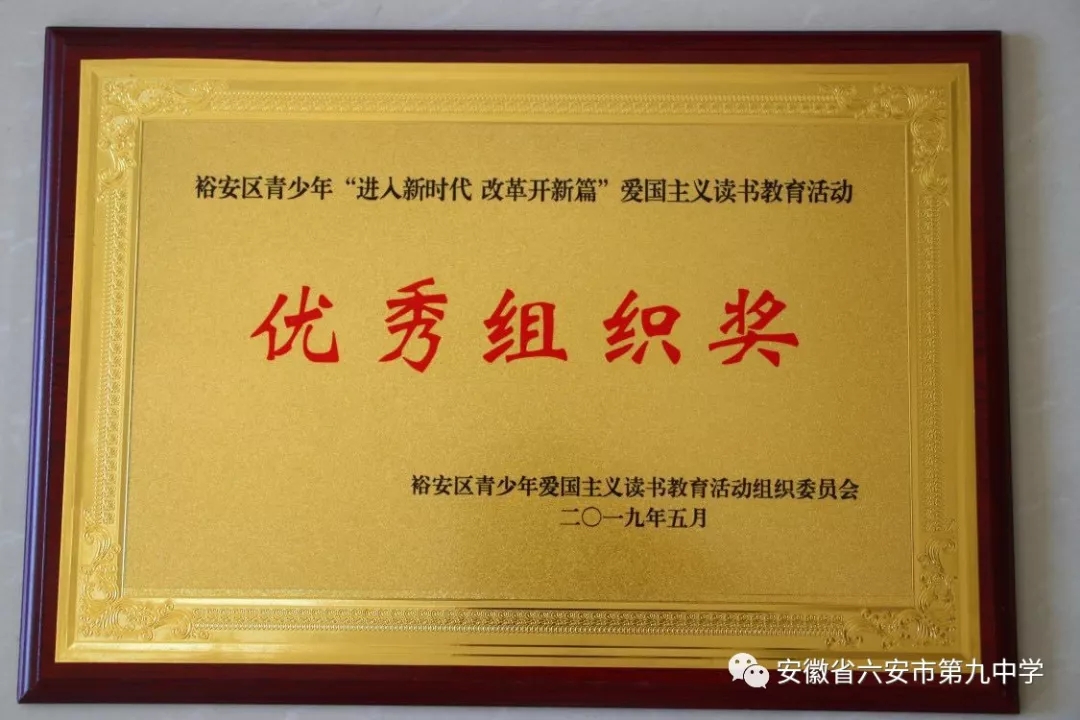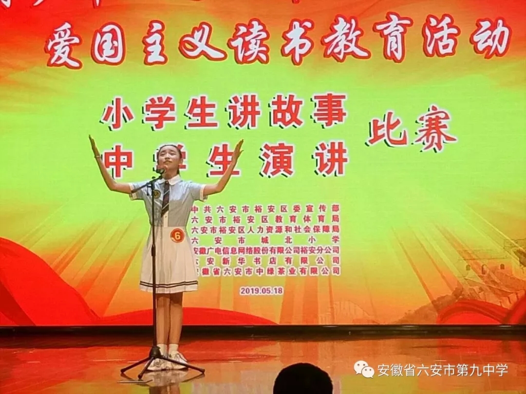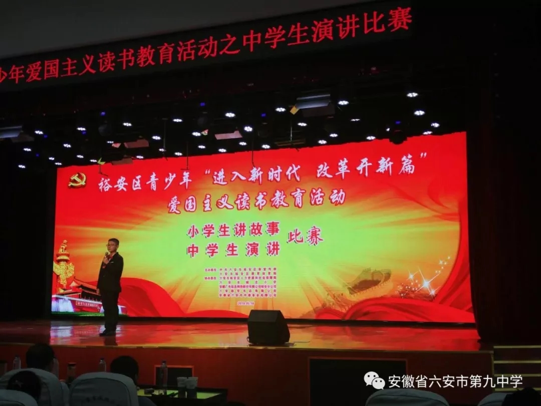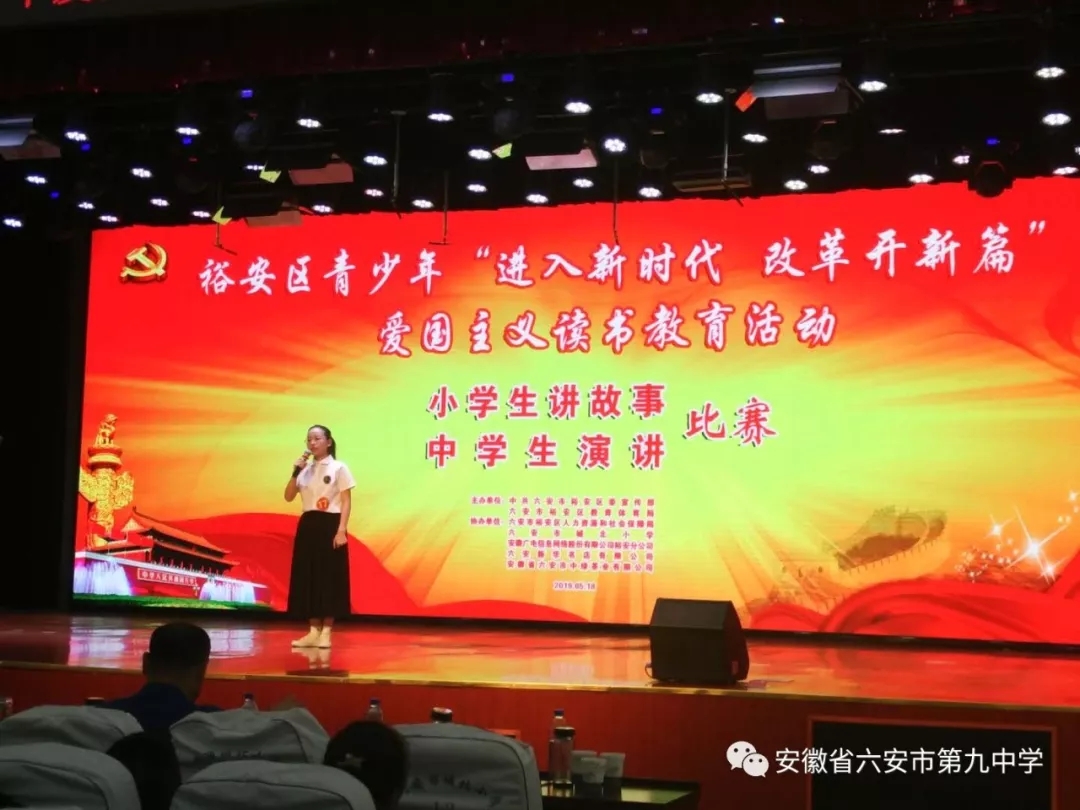 5月18日下午,以“进入新时代 改革开新篇”为主题的裕安区第26届青少年爱国主义读书教育活动之中学生演讲比赛在城北小学圆满落幕。来自全区中学的27位优秀选手汇聚一堂,经过激烈角逐,我校八(17)班杨蕊、七(6)班陈菲阳均喜获全区爱国主义读书演讲比赛一等奖,七(10)李强获优秀奖,其中杨蕊同学将代表裕安区参加市级比赛,六安九中荣获“进入新时代 改革开新篇”爱国主义读书教育活动“优秀组织奖”。