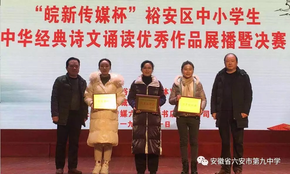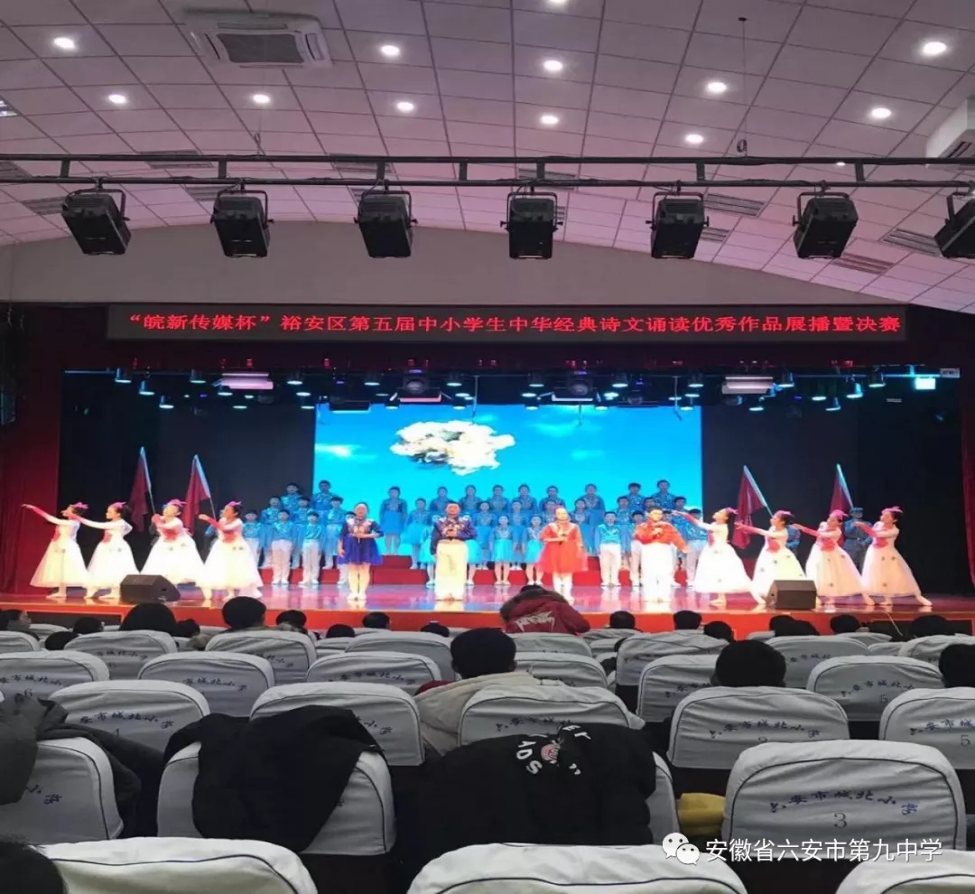 为弘扬中华民族优秀传统文化,传承中华经典,提高中小学生们的人文素养和道德情操,推动校园文化建设,2019年3月1日下午,六安市裕安区教育体育局在城北小学组织进行了“皖新传媒杯”裕安区第五届中小学生中华经典诗文诵读优秀作品展播暨决赛活动。活动中孩子们的精彩诵读,评委们的认真负责,使得大赛进行的异常顺利。六安九中的诵读代表队在此次活动中荣获了初中组特等奖和优秀组织奖。