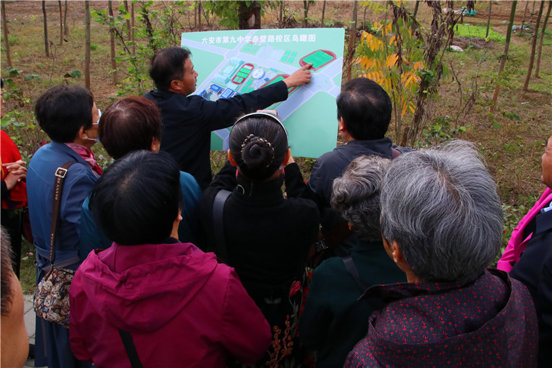 老教师们还来到六安九中赤壁路校区选址,大家饶有兴趣地观看了赤壁路校区鸟瞰图,听取了赤壁路校区工程建设进展情况和发展概况。六安九中赤壁路校区位于青桐路与赤壁路交叉口东北侧,毗邻六安市体育中心,可近望六安市电视台电视塔。占地面积达60400平方米,其中地上建筑面积30000平方米,地下建筑面积15000平方米,并设有大型图书馆、椭圆形体育馆。预计在2020年年底动工建设,2022年9月投入使用。参观考察过后,退休老教师们对六安九中教育集团的飞速发展和广阔前景非常满意、赞叹不已。