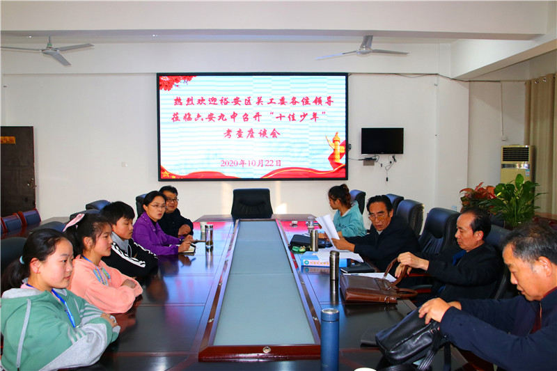 10月22日下午,裕安区关工委常务副主任汤浩、副主任张绪龙、区教体局关工委主任张家鼐及区文明办工作人员一行4人莅临六安九中召开“十佳少年”候选人座谈会,考查学校推荐的裕安区第六届“十佳少年”候选人李东暾同学。