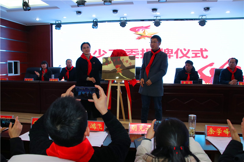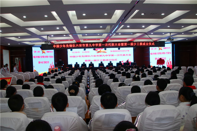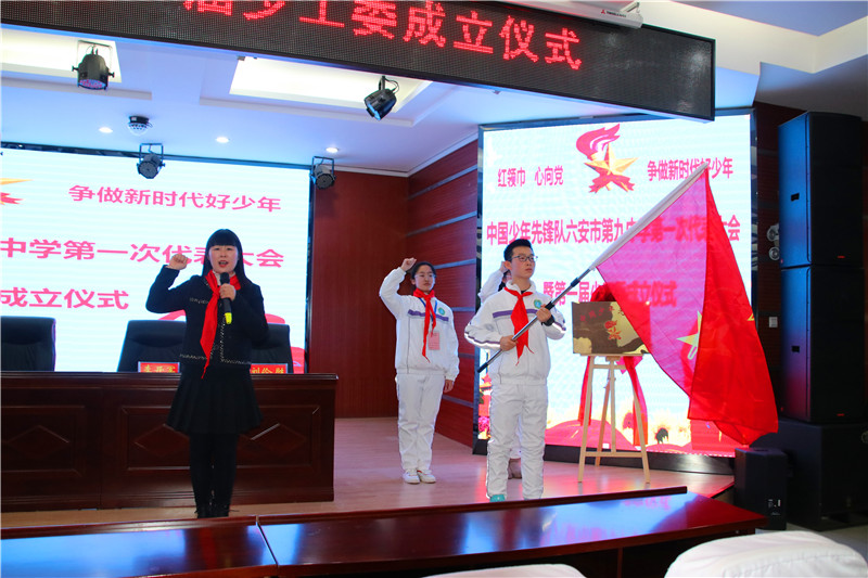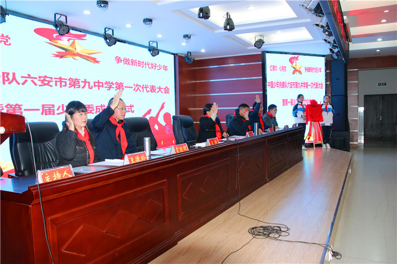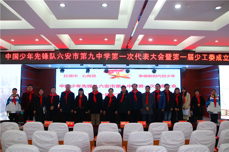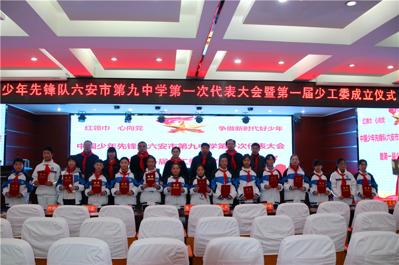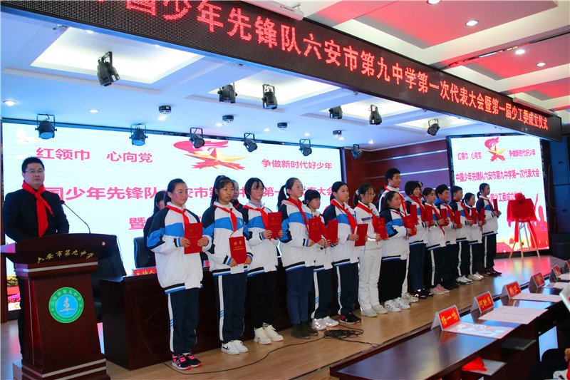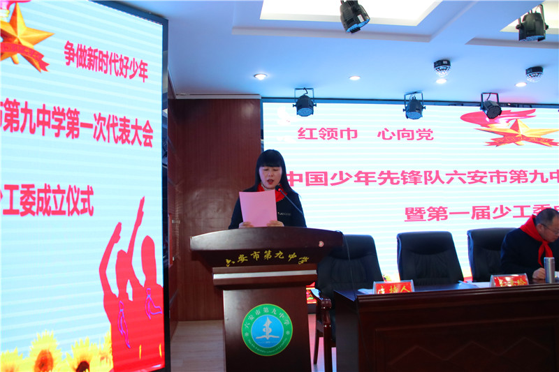 副校长霍朝晖宣读了《关于成立中国少年先锋队六安市第九中学少工委的请示》的批复文件。选举产生了六安九中学第一届少工委。在全场热烈的掌声中,执行校长李艳和团委书记刘伦胜为六安九中少工委揭牌。