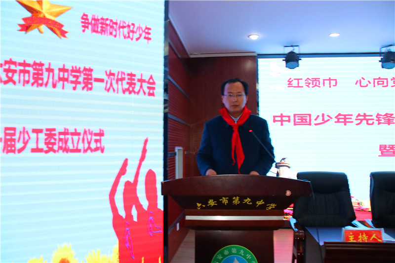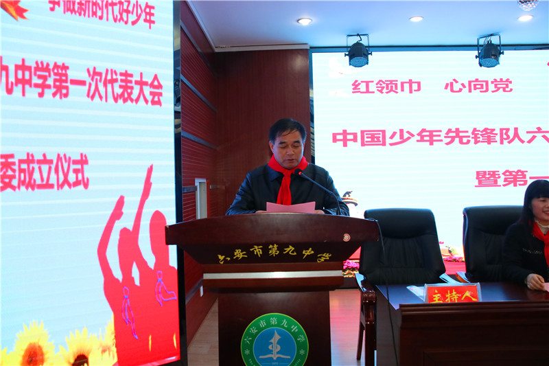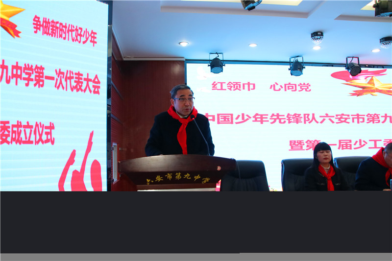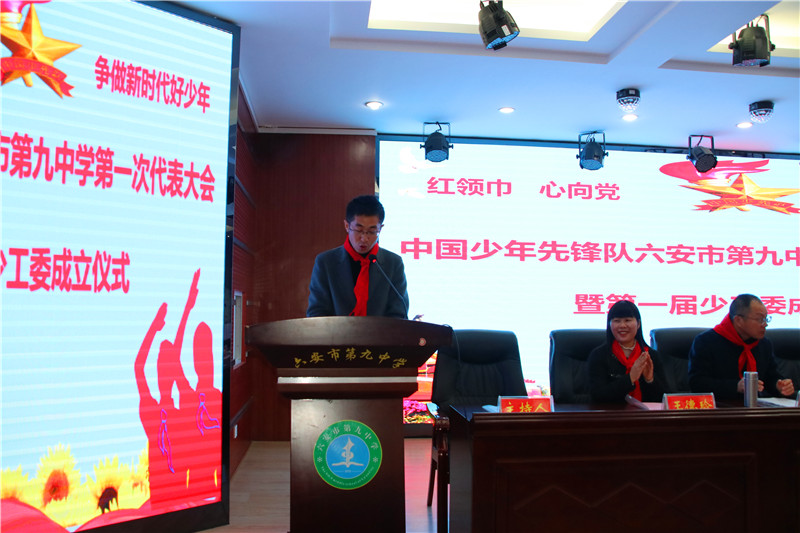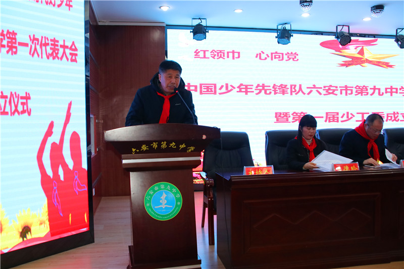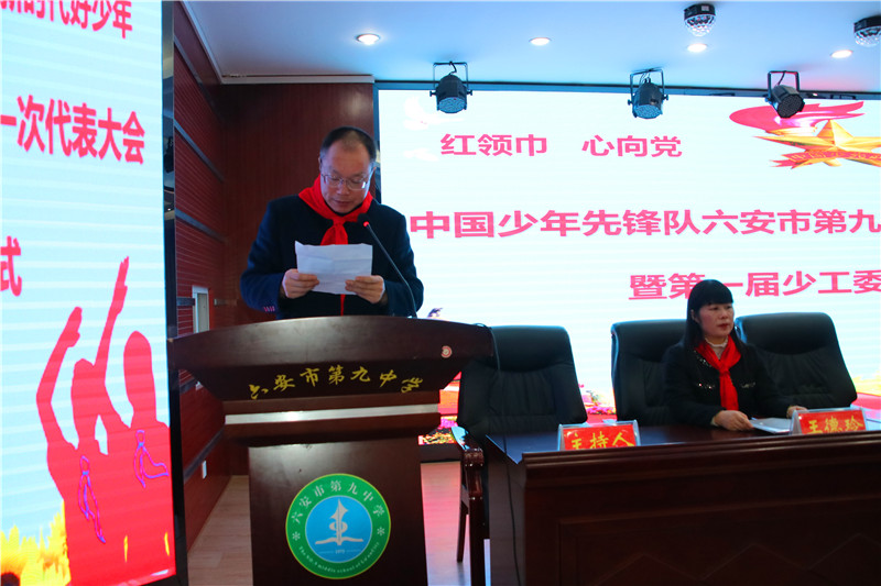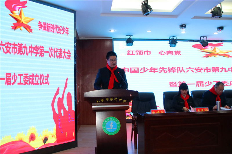 区委教育工委副书记李胜致祝辞。李胜强调,少先队工作是学校工作的重要组成部分,促进少先队工作与学校教育教学工作的高度融合是落实践行社会主义核心价值观的有效途径。学校少工委要更好地履行少先队组织职能,实现少先队组织根本任务,在服务大局、服务少年儿童健康成长中发挥更大作用,努力担当起培养中国特色社会主义事业合格建设者和可靠接班人的历史重任。他希望,六安九中在今后的工作中,能够进一步落实好少先队改革重任,聚焦思想政治引领,开设好少先队活动课,研究和拓宽辅导员职业成长路径,推动少先队事业持续健康发展。