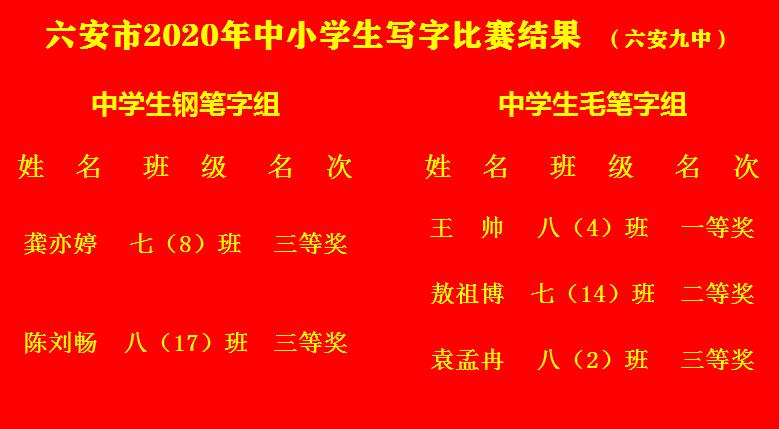 在六安市2020年中小学生写字比赛中,我校参赛学生获奖情况。