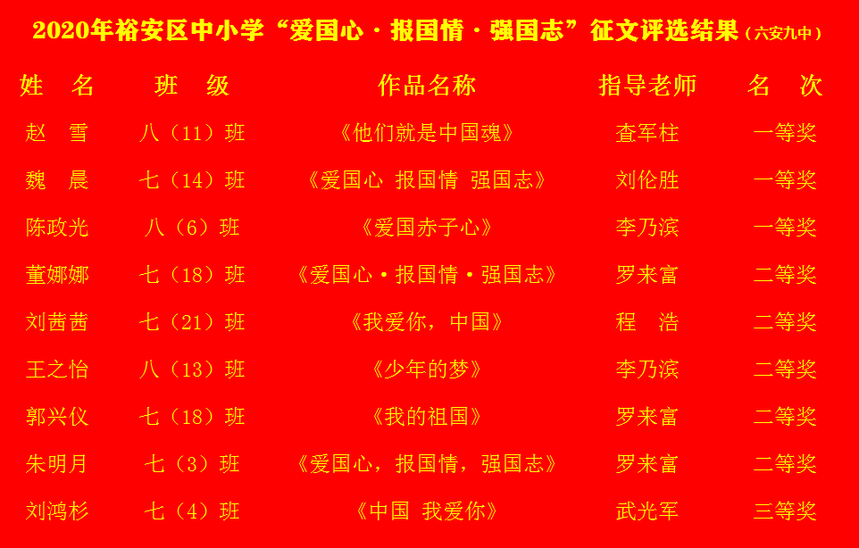 为深入贯彻落实习近平新时代中国特色社会主义思想,进一步引导广大青少年涵养家国情怀,坚定民族自信,积极培育社会主义核心价值观。近日,裕安区委教育工委开展了全区中小学“爱国心·报国情·强国志”征文评选活动。活动开展以来,六安九中高度重视、紧密配合、精心组织,深入宣传,学生踊跃参加、参与面广。涌现出一大批优秀的征文作品,报送的作品全部获奖。其中,荣获区级一等奖3篇(共5篇)、二等奖5篇(共11篇)、三等奖3篇。现将我校学生获奖情况公布如下: