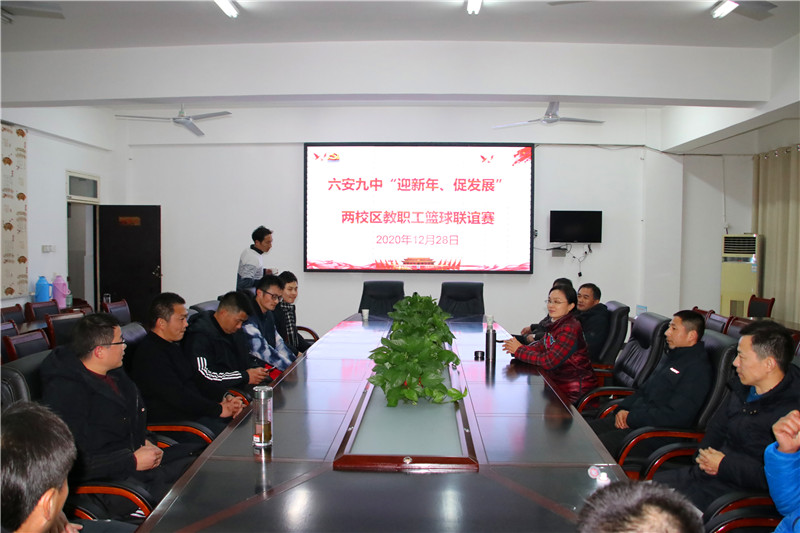 赛前,区委教育工委副书记、六安九中校长李胜站在集团发展的高度指出,今天学校举办的两校区篮球联谊赛,目的就是借助这场比赛喜迎新年,通过互动交流,促进两个校区共同发展。两个校区同气连枝,希望队员们发扬“友谊第一,比赛第二”的精神。