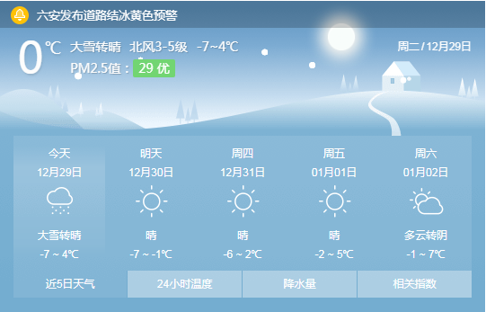 2021年元旦将至,受强冷空气影响,今天我省有一次极寒雨雪天气及8-10级大风,气温下降8-12度,请及时关注天气变化情况。预计12月29日~1月2日,六安市持续低温冰冻天气,大部分地区有道路结冰。
