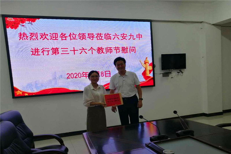 王区长代表区委、政府为学校送上节日慰问金,六安九中执行校长李艳激动地接过慰问金,向领导表示感谢。