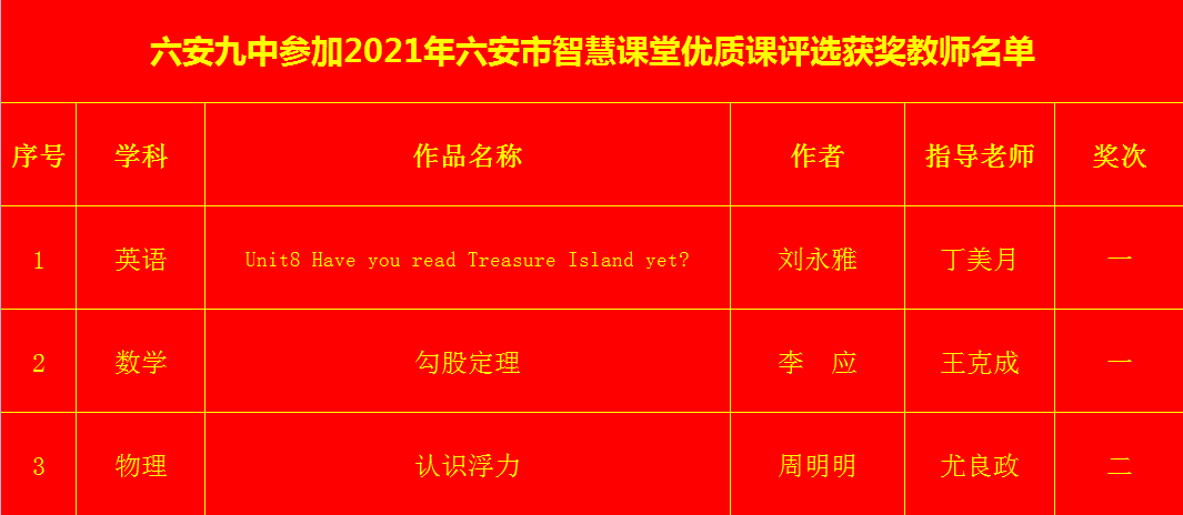 近日,六安市2021年智慧课堂优质课评选结果揭晓。六安九中的刘永雅、李应、周明明三位老师喜获佳绩,分别获得英语组一等奖、数学组一等奖、物理组二等奖的骄人成绩。