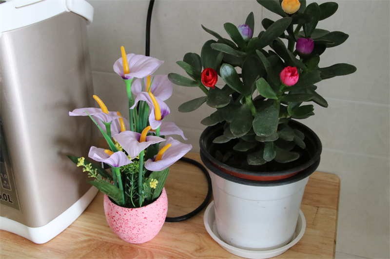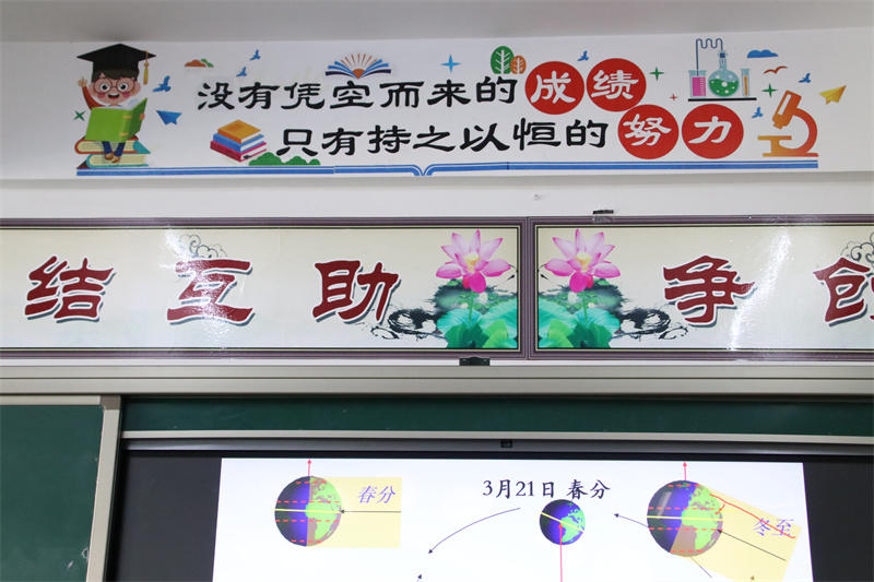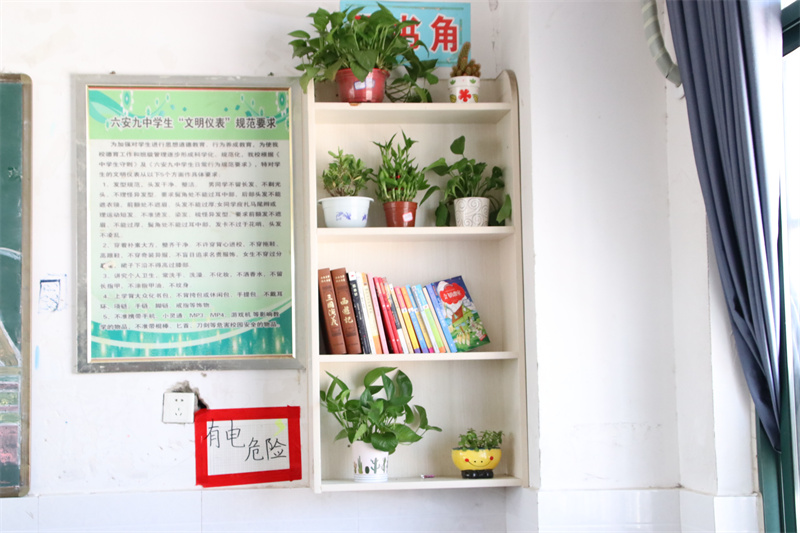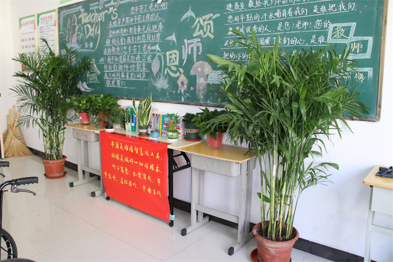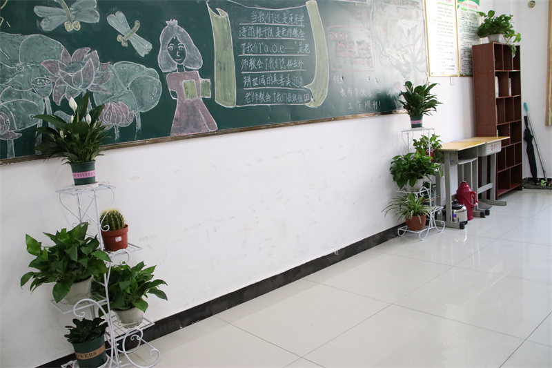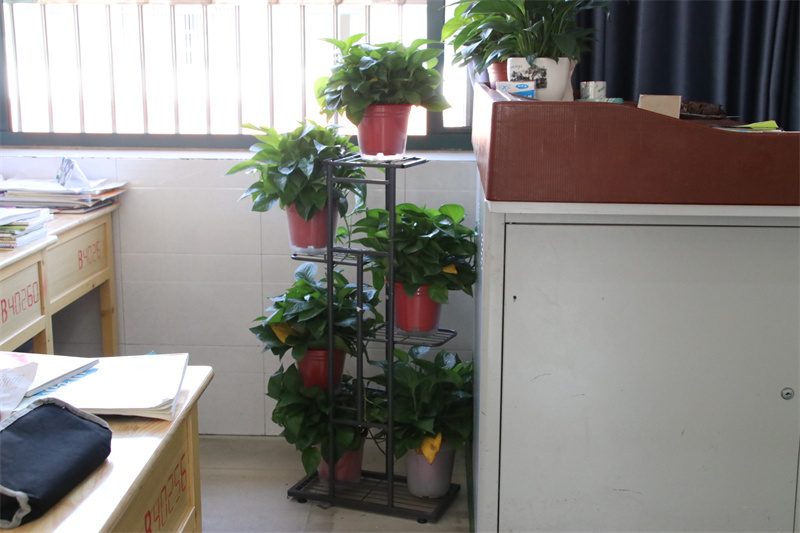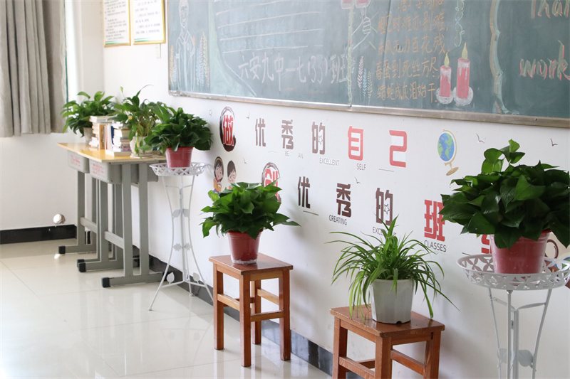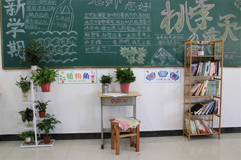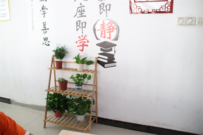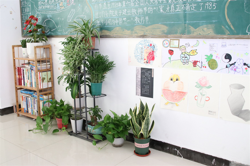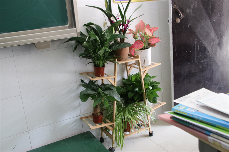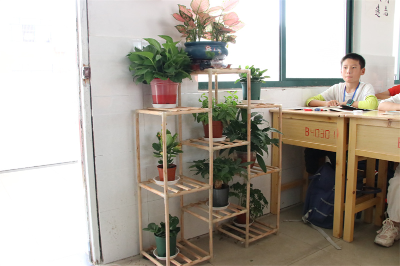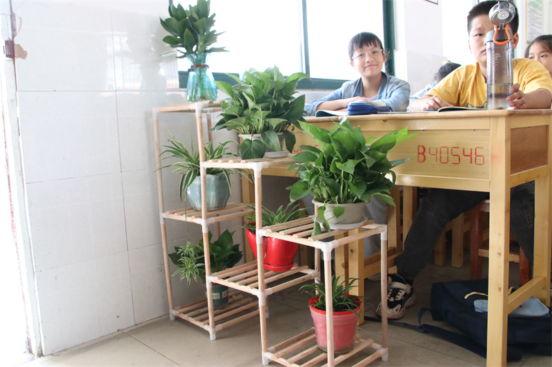 教室内摆放的盆栽绿意盎然,富有生机。同学们学习之余,在教室里就可以亲近自然,放松心情。
