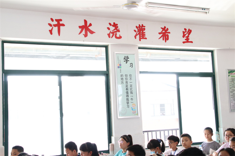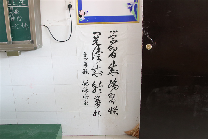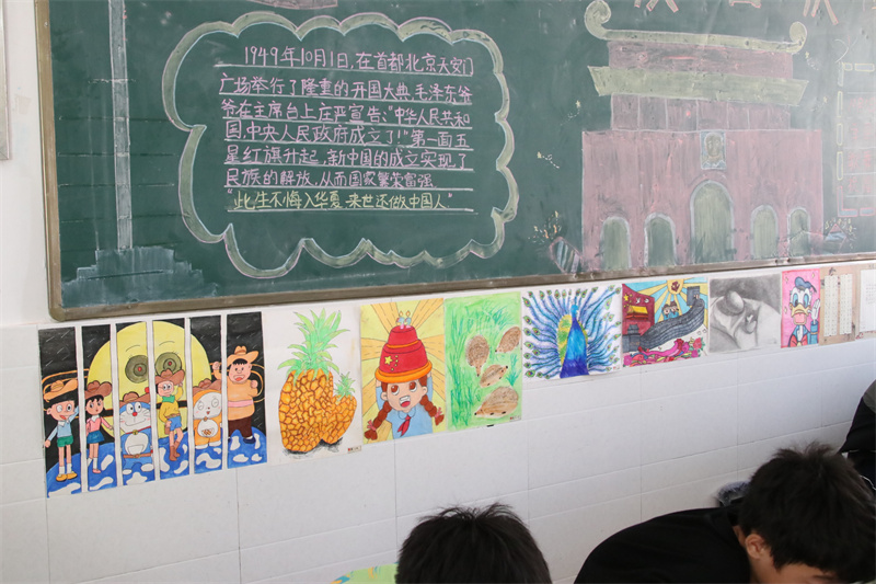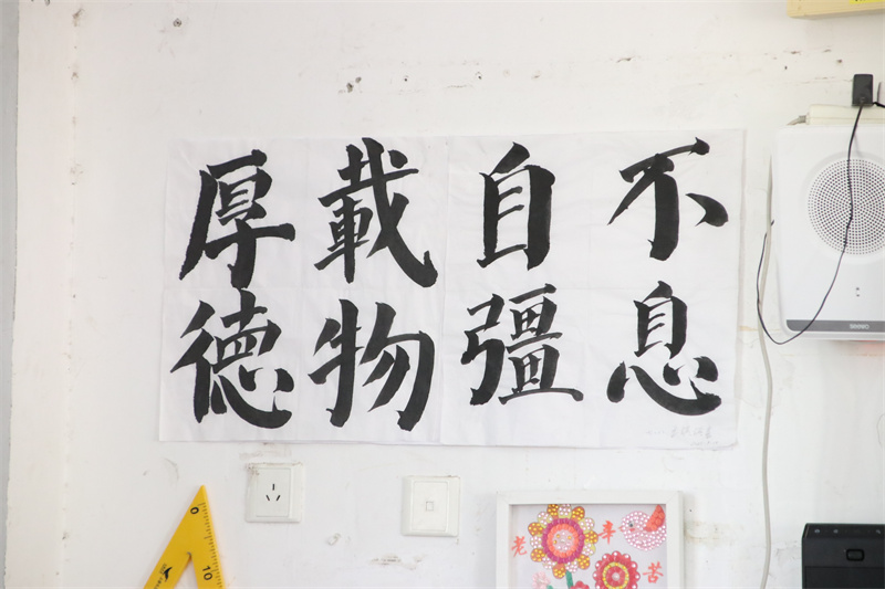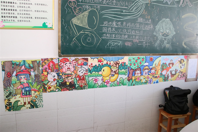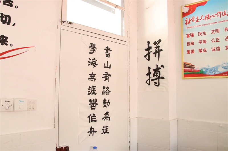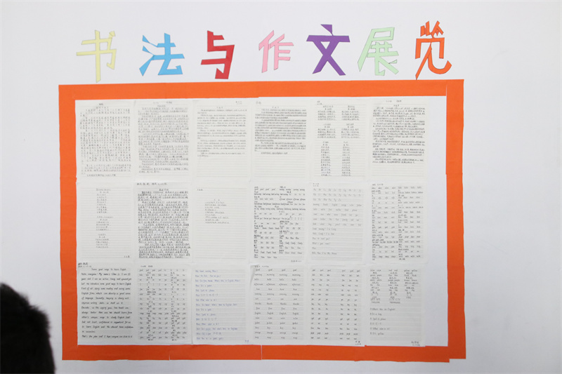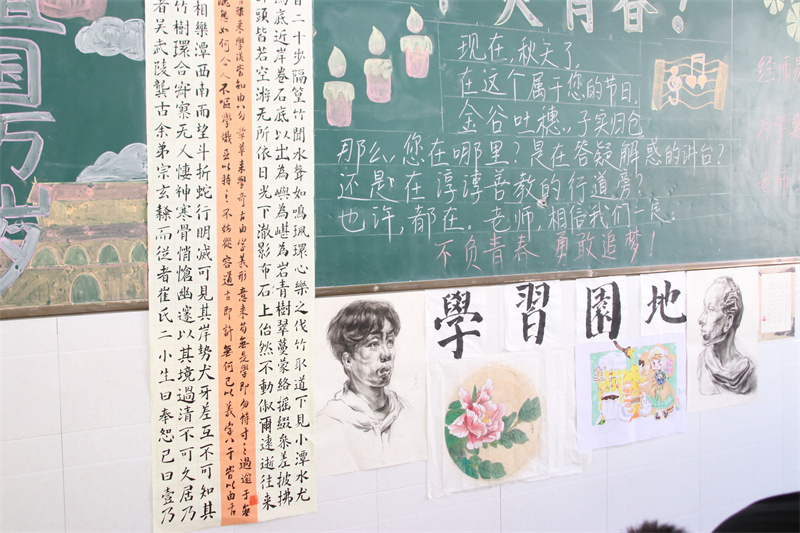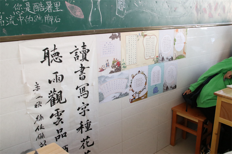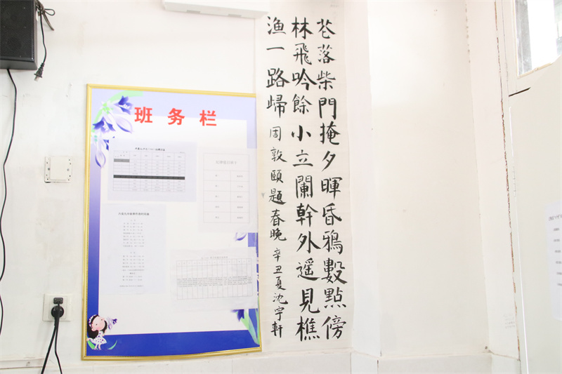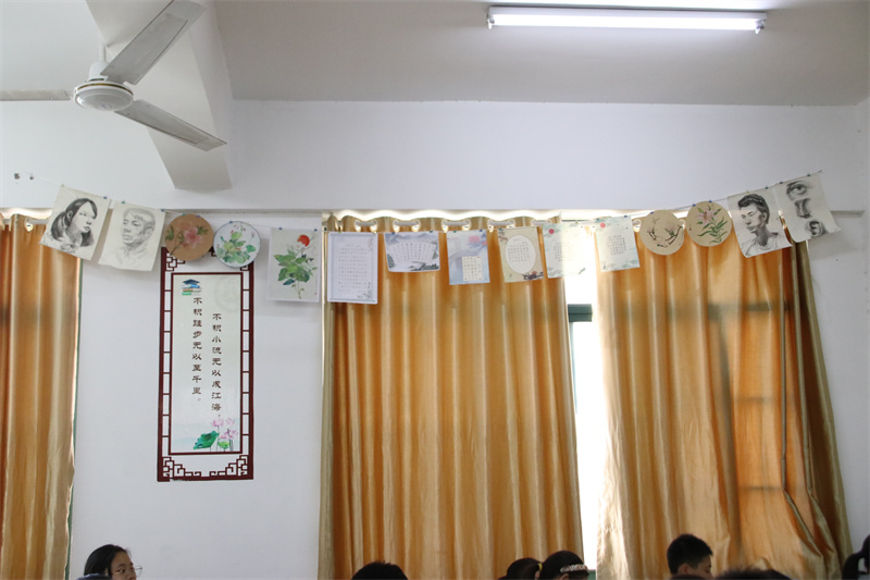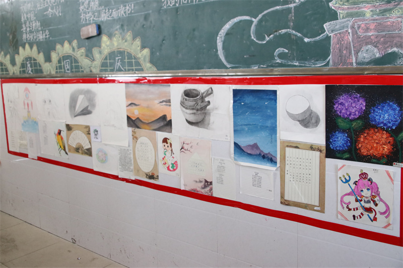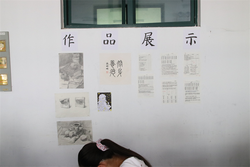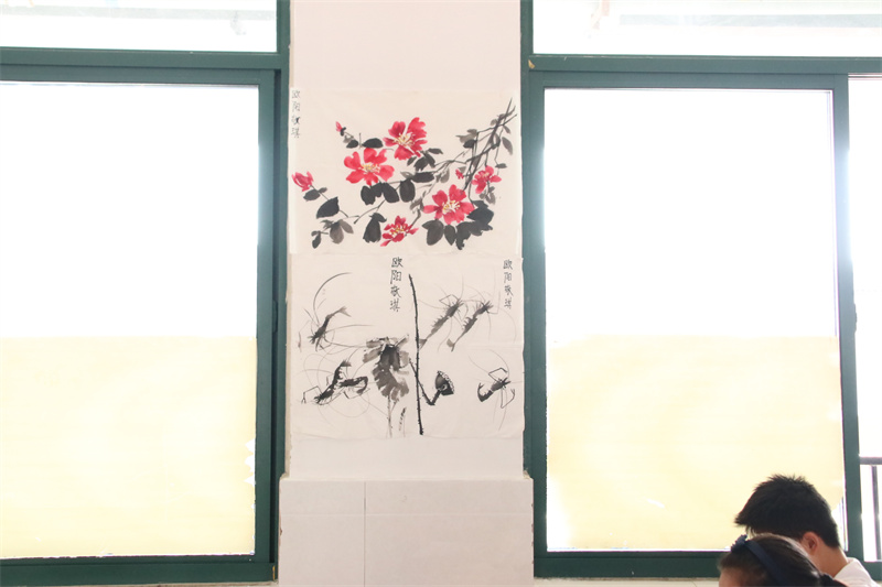 墙壁上同学们展示了自己的书法作品和绘画作品,使这里成为了一处亮丽的风景。