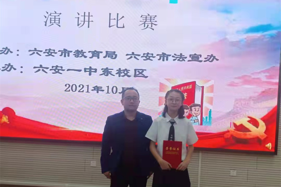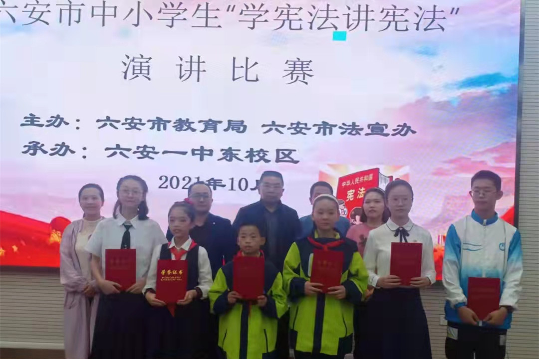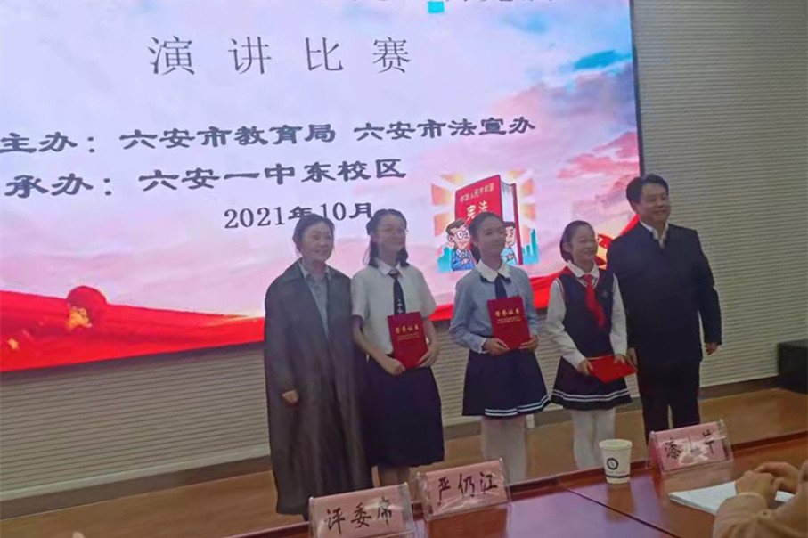10月10日上午,由六安市教育局、六安市法宣办联合主办的中小学生“学宪法讲宪法”演讲比赛和知识竞赛拉开帷幕。来自全市各县区的17名选手参加了演讲比赛,六安九中八(9)班张婉同学在众多选手中脱颖而出,以9.64分的优异成绩荣获一等奖。