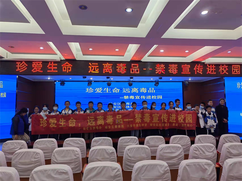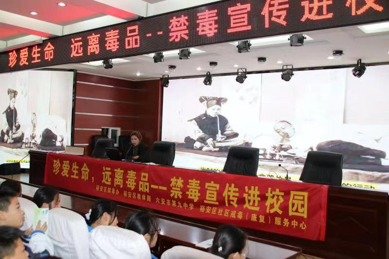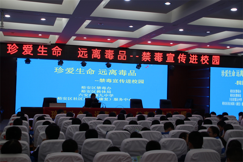 为进一步增强广大青少年的禁毒意识以及自觉抵制毒品侵袭的能力,构筑控制毒品的校园防线,根据省、市关于禁毒工作的文件和会议精神要求,10月22日下午,六安九中邀请裕安区社区戒毒(康复)服务中心的工作人员走进校园开展禁毒宣传活动并举行禁毒知识讲座。