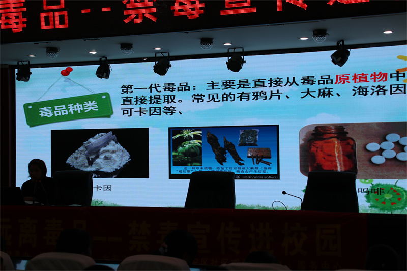 讲座中,各种图片的展示和介绍,使学生全面认识了毒品的定义、来源、分类及其危害。主讲人分别就第一、二、三代毒品进行了详细介绍,并分析其危害,警示大家一定要提高认识、辨别毒品的能力。