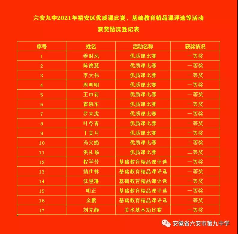 百花齐放展风采,乘舟破浪扬风帆。在刚刚结束的裕安区2021年优质课、基础教育精品课、美术基本功比赛三项评选活动中,六安九中17名参赛教师全部获奖。其中,在优质课大赛中,姜时凤、陈德慧、李大伟、周明明、王中莉、霍晓东、罗来虎、叶冬青、丁美月荣获一等奖,洪礼扬、冯文娟荣获二等奖;在基础教育精品课评选中,程学芳、翁仕林、沈慧琳、明正、金鹏荣获一等奖;在中小学美术基本功大赛中,刘先静荣获一等奖。