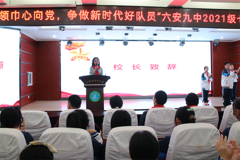 六安九中党总支书记、校长、少工委主任李艳致辞。致辞中,李艳向新队员表示衷心的祝贺,对辛苦付出的大队辅导员们表示最诚挚的感谢,并详细介绍了队徽标识的意义和少先队组织的使命。她希望,同学们勇于创新,敢于实践,立志终身学习,养成良好的思想道德品质,争当热爱祖国、理想远大的好少年,争当勤奋学习、追求上进的好少年,未来成为一个合格的社会主义建设者和接班人。