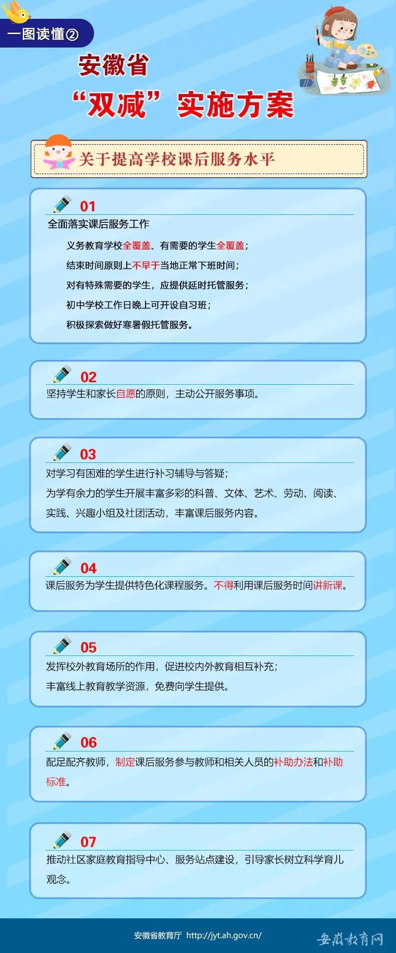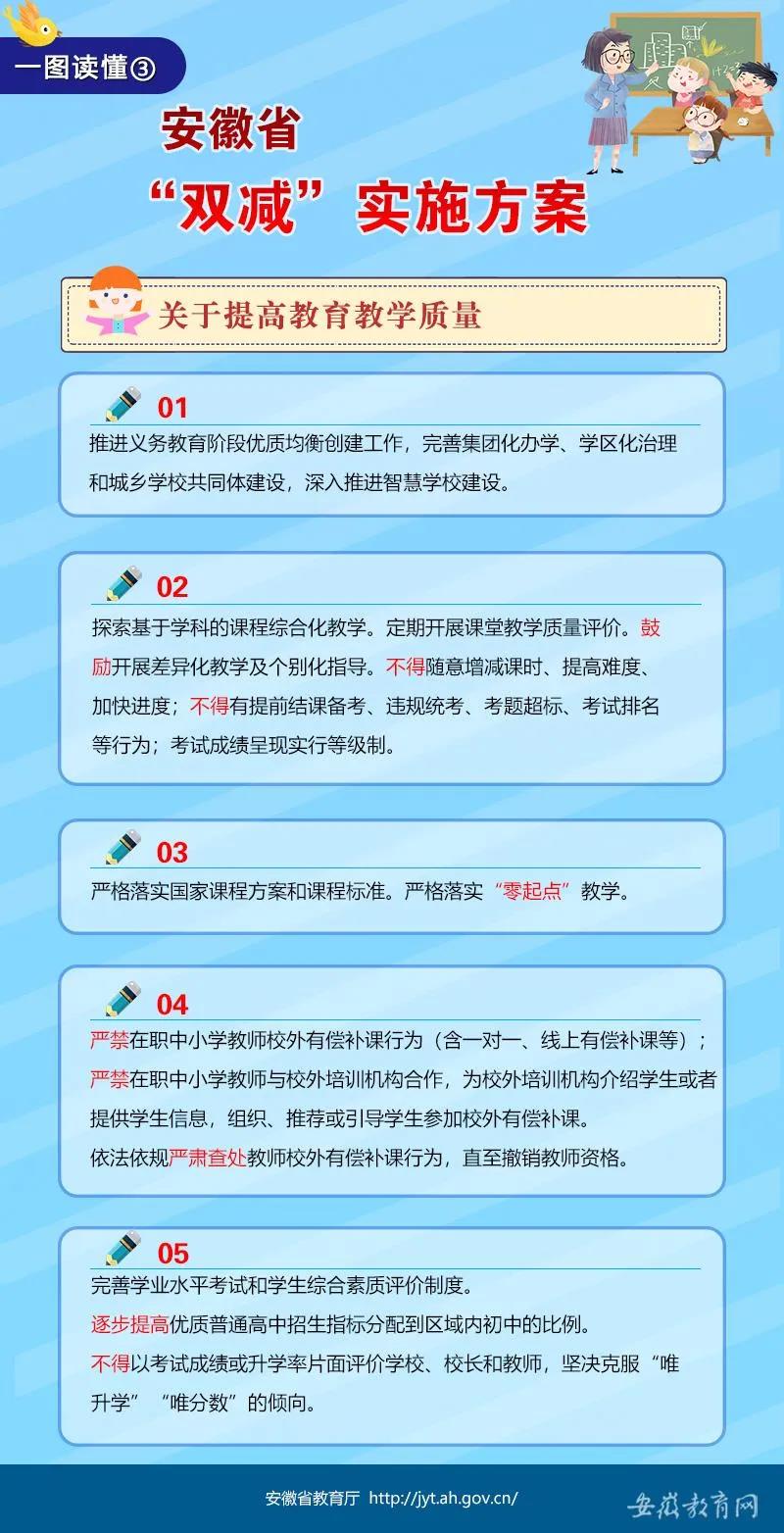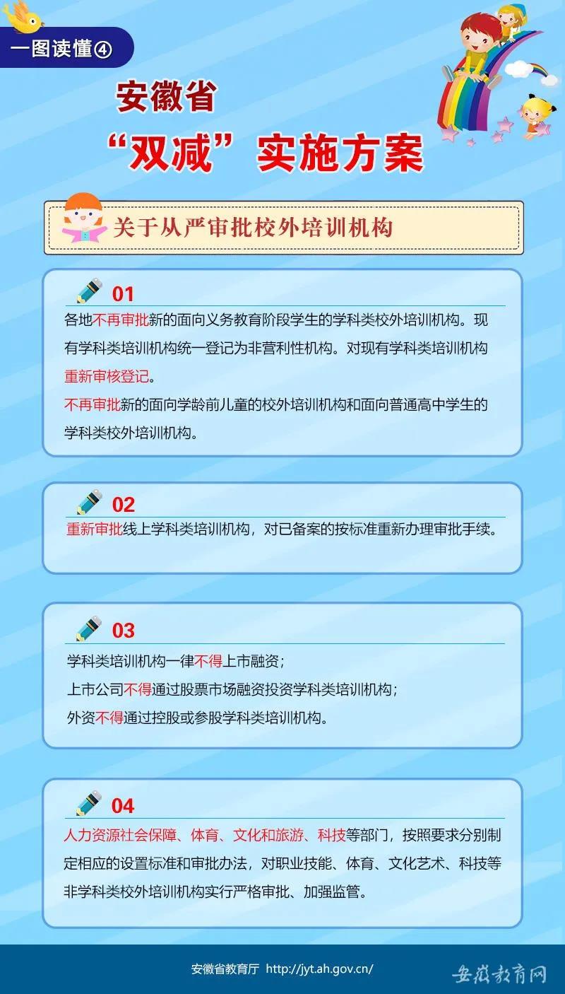 “双减”是党中央做出的一项重大决策部署,事关国家发展和民族未来。对促进学生全面发展、健康成长,有效缓解家长焦虑情绪,构建教育良好生态具有重大战略意义。 11月1日,安徽出台《安徽省进一步减轻义务教育阶段学生作业负担和校外培训负担的实施方案》,即“双减”政策文件正式出台。《方案》对作业布置、批改、校外培训收费等问题做了明确要求。