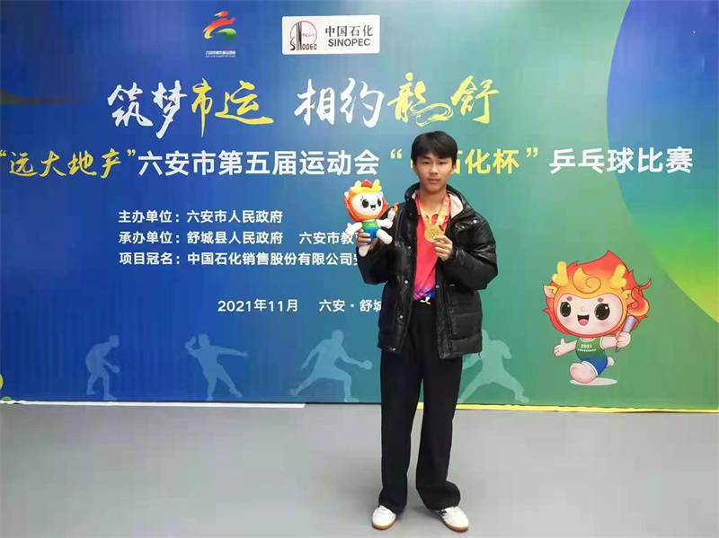 11月13日,在六安市第五届运动会乒乓球比赛中,六安九中八(8)班葛梓恒同学代表裕安区参赛夺得青少年男子组第一名。