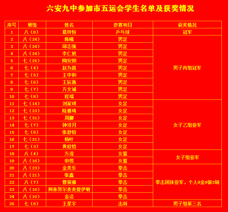 在本届市运动会上,六安九中共有20余名同学代表裕安区参加了篮球、足球、乒乓球、拳击、击剑、田径等项目的比赛,各项赛事均获得优异的成绩。