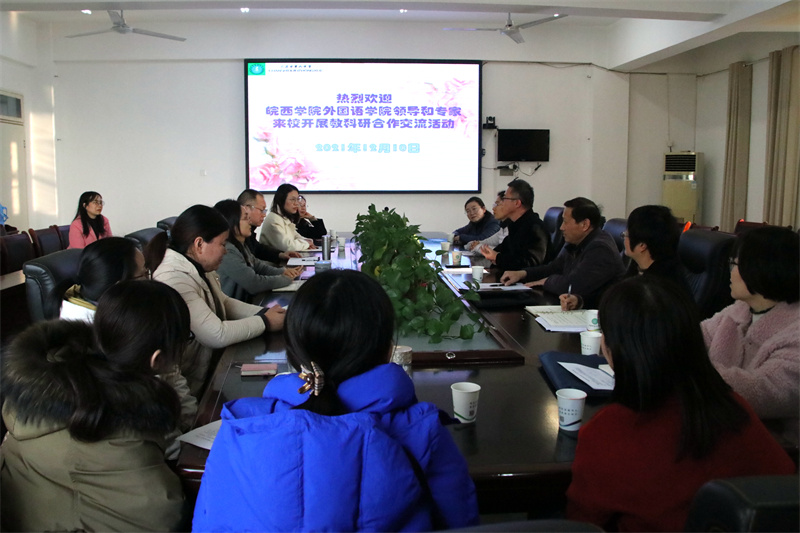 在皖西学院外国语学院与六安九中相关领导分别介绍了各自学校的基本情况、发展思路和近几年所取得的成绩后,双方就“深度合作推动融合发展和创新发展”这一议题展开了商谈。两校领导就互派教师授课、讲座,参加对方学校的教育教学精品活动,合作开展课题研究等达成一致。