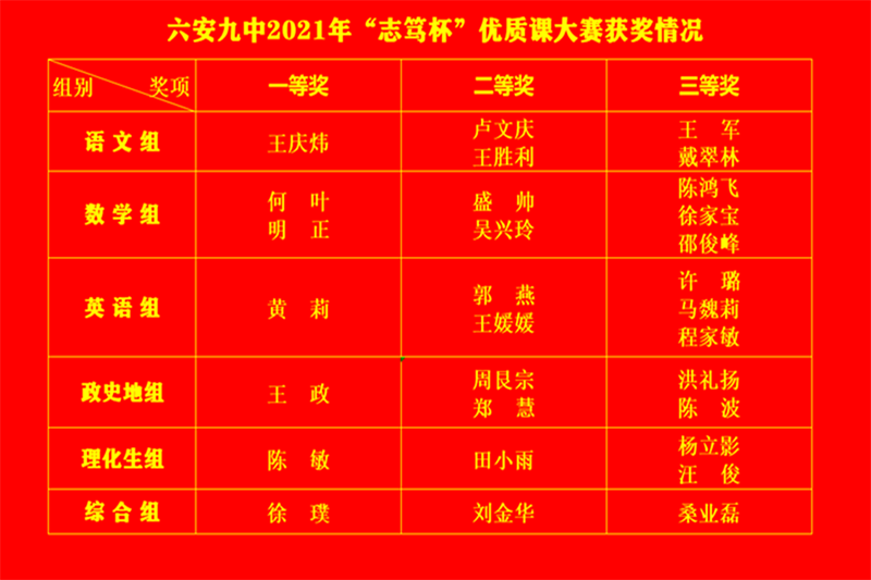 六安九中2021年“志笃杯”优质课大赛圆满落下帷幕。学校将以本次教学大赛为契机,加大对中青年教师培养的力度,以赛促研,赛研一体,注重实践,锤炼骨干,促进成长,力争使中青年教师“三年出骨干,五年成名师。”这次教学大赛,为中青年教师提供了展示才华的舞台,提升了中青年教师的教学水平,提高了学校的整体课堂教学质量。(文/卢文庆)