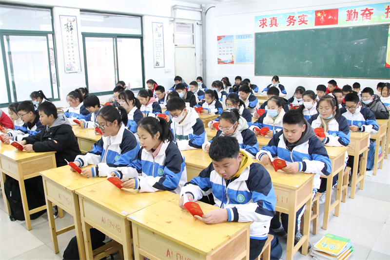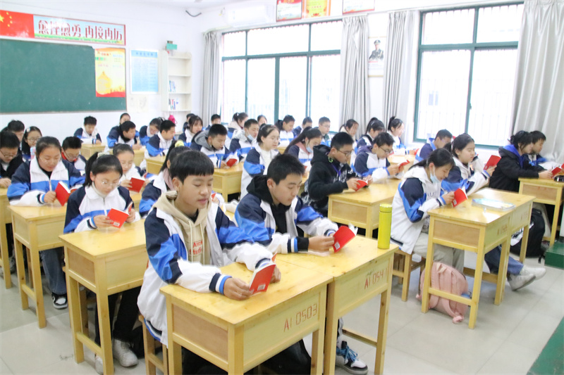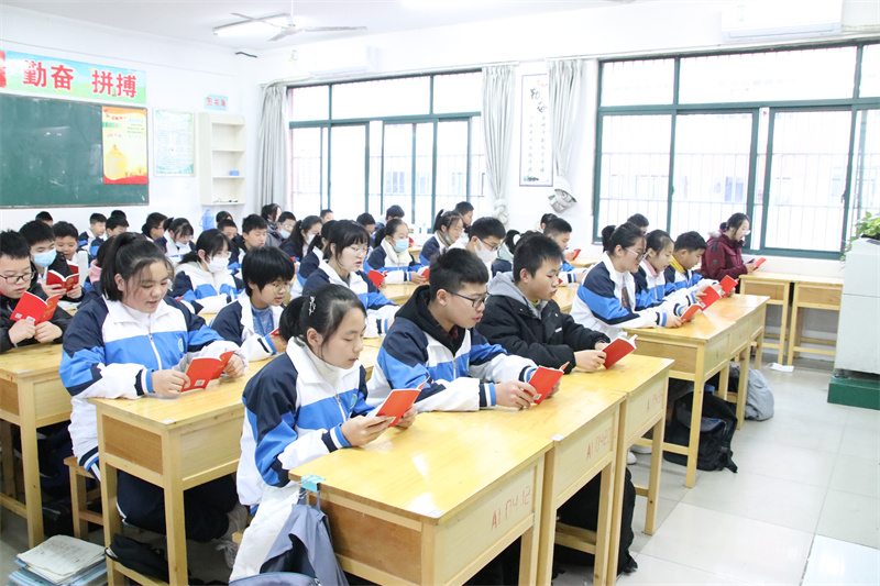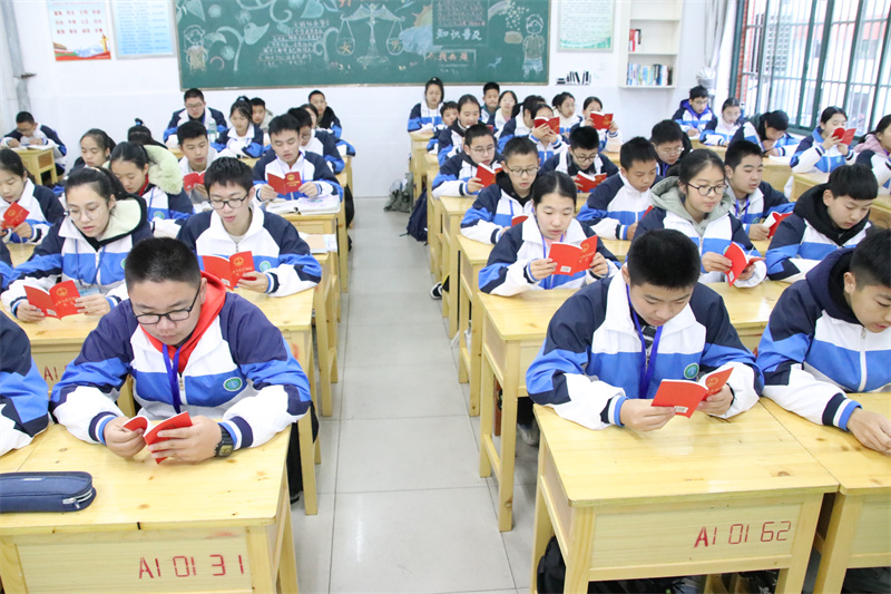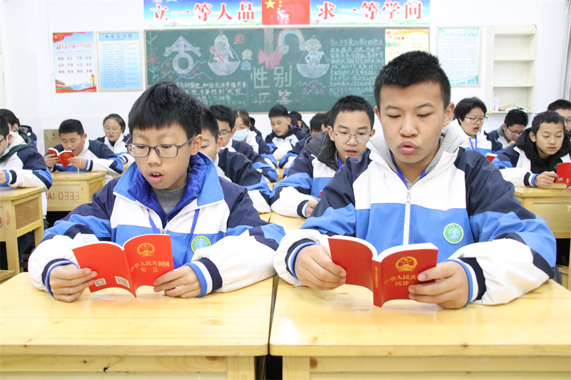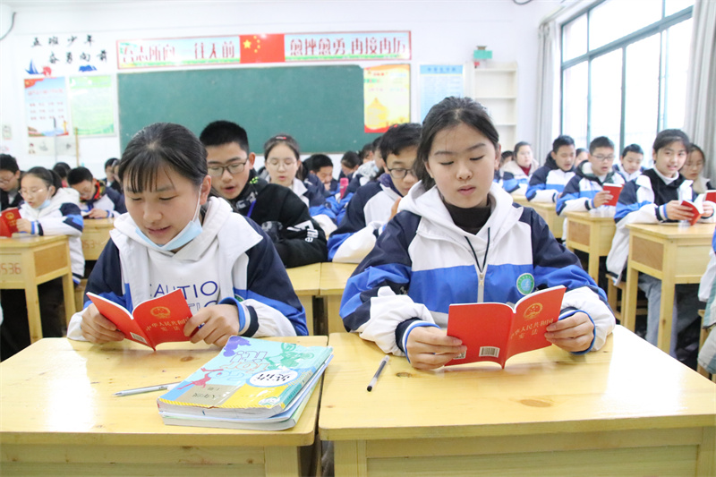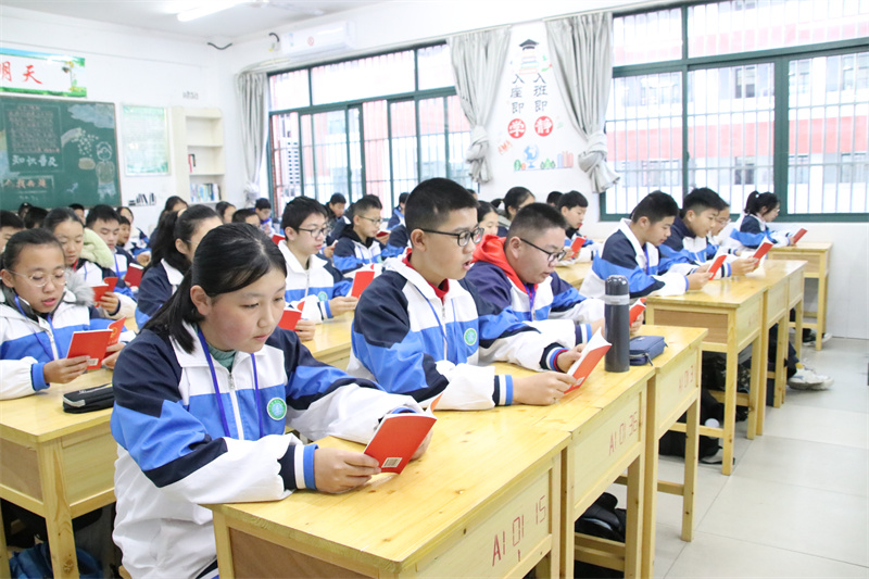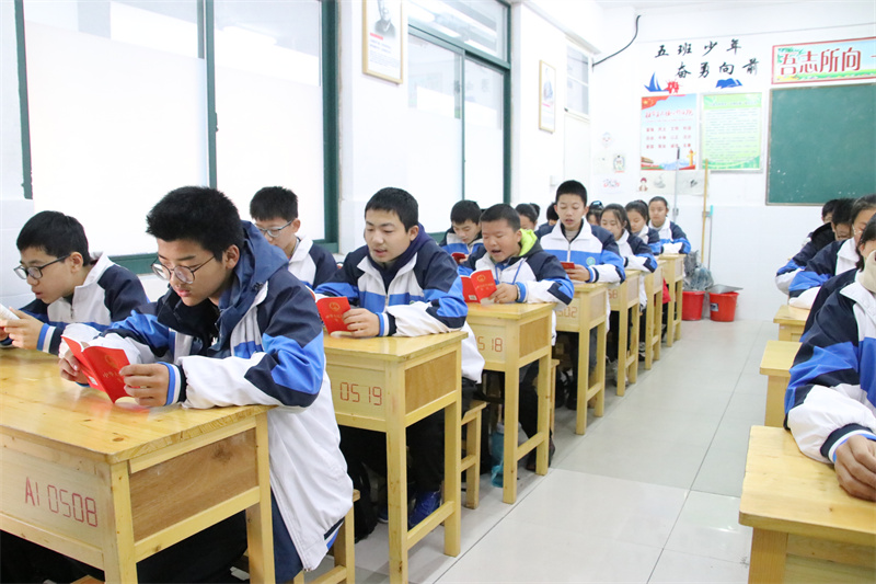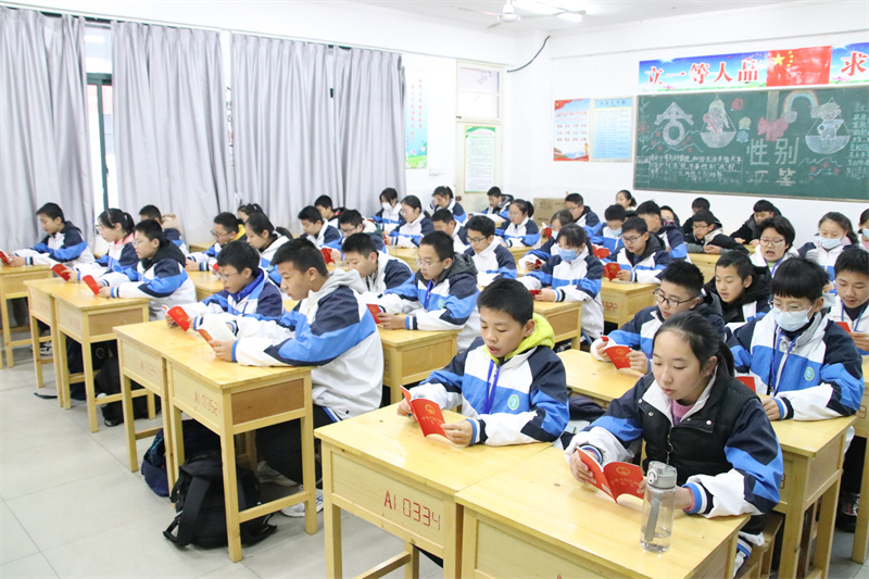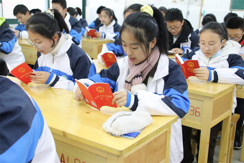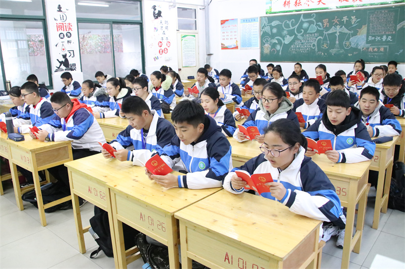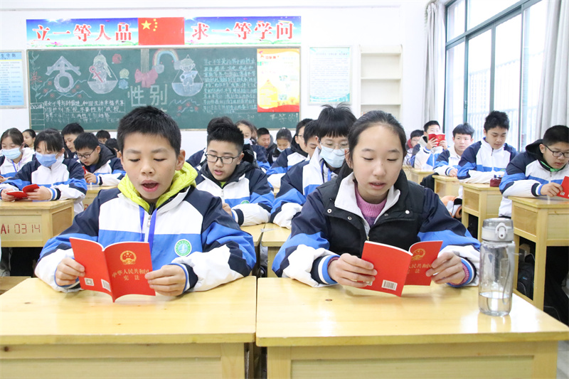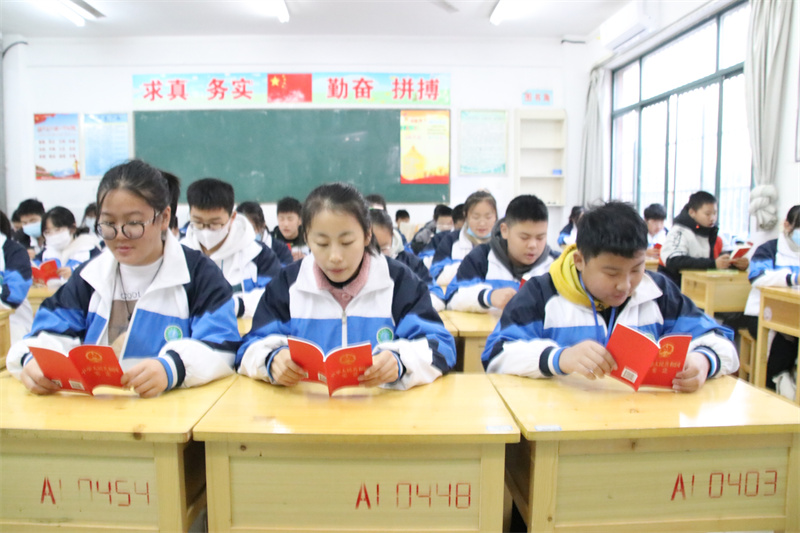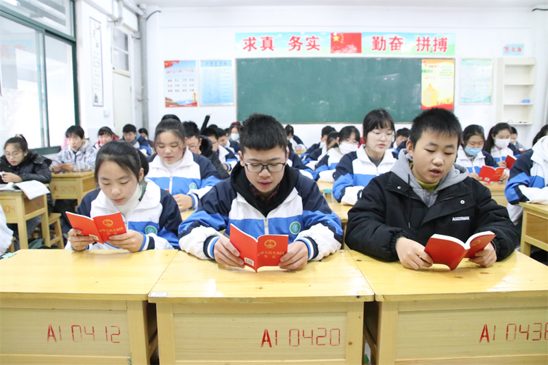 “中华人民共和国是工人阶级领导的以工农联盟为基础的人民民主专政的社会主义国家。中华人民共和国实行依法治国,建设社会主义法治国家……”本周,各班级开展宪法晨读活动。老师和同学们选择了《宪法》序言及正文中的个别章节、条款,进行集体朗读。他们手捧《宪法》,大声诵读,共同感受宪法权威,了解宪法赋予我们每个人的责任和义务,表达自己对宪法的敬意,把宪法信仰镌刻在心中。