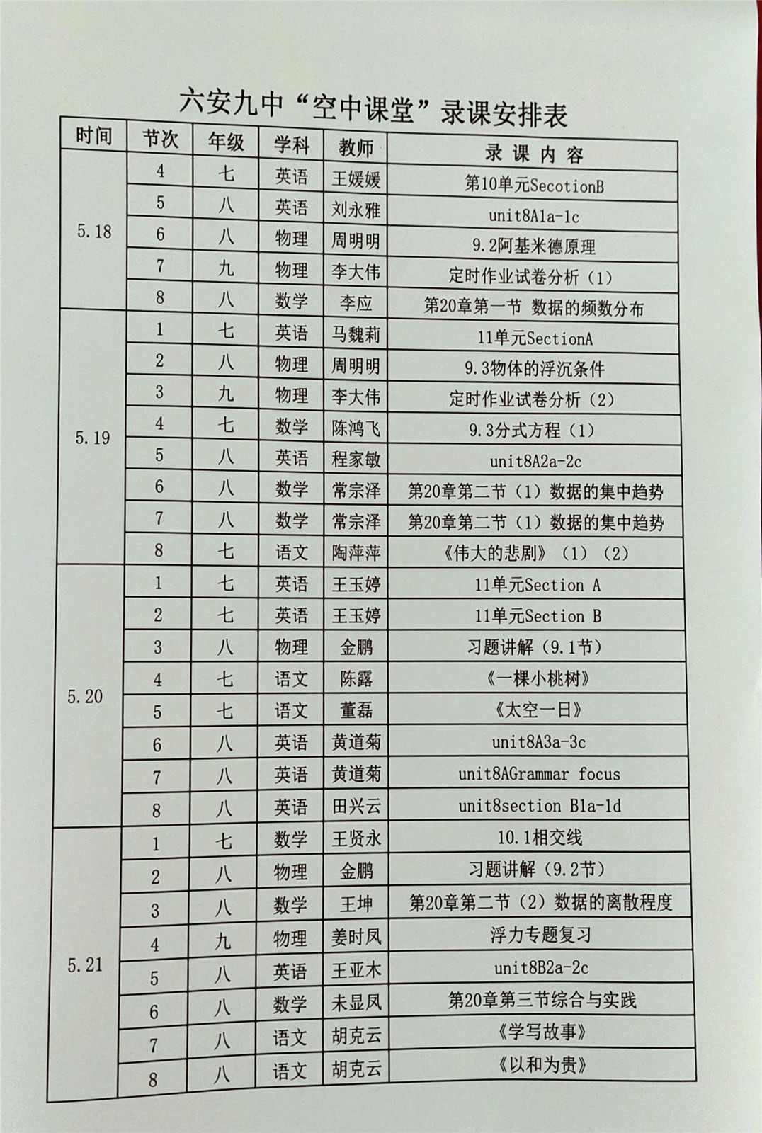 初夏五月,一场突发的疫情,再次吹响了战“疫”的号角。六安九中闻“疫”而动,积极配合政府部门开展核酸检测和疫情防控部署。因为疫情防控需要,市区不少小区实施封闭管理,我校部分同学为积极配合政府防疫管控,自觉居家学习。为了最大限度地减少疫情给居家同学的学习带来的影响,帮助他们始终保持良好的学习状态,学校精心谋划、合理安排,扎实有效地开展了线上教学工作。