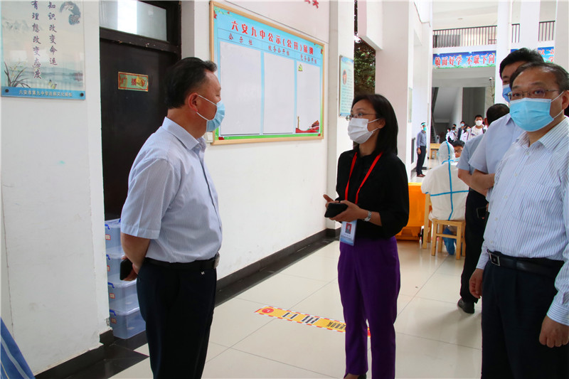 近日,国务院联防联控机制综合组安徽工作组组长、国家疾控局副局长孙阳,在市委常委、副市长束学龙,区委书记王仲儒,区委常委、副区长李守富,区教育工委书记、区教体局局长张恩平等市、区领导的陪同下,莅临六安九中调研第三轮核酸检测和疫情防控工作。六安九中李艳校长向孙阳一行详细介绍了学校第三轮核酸检测及常态化疫情防控部署工作落实情况。