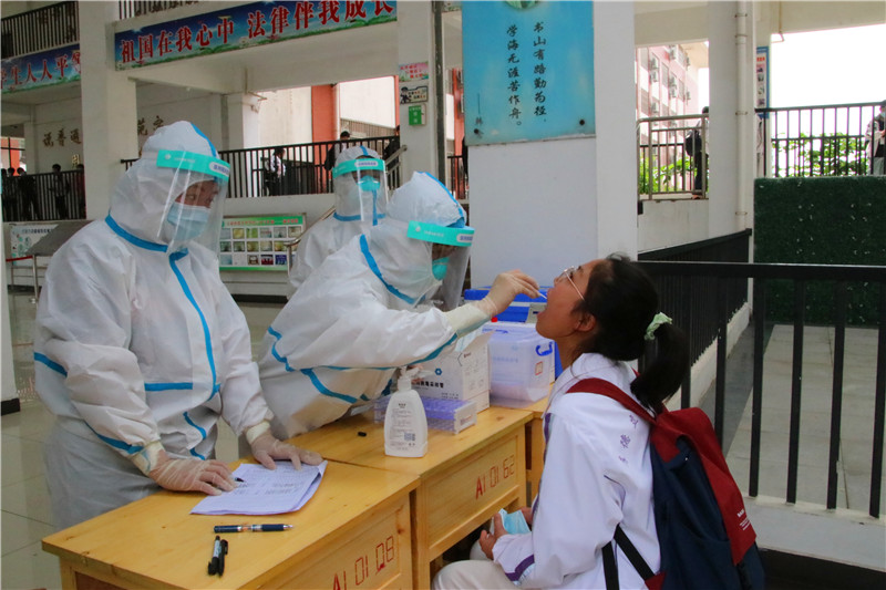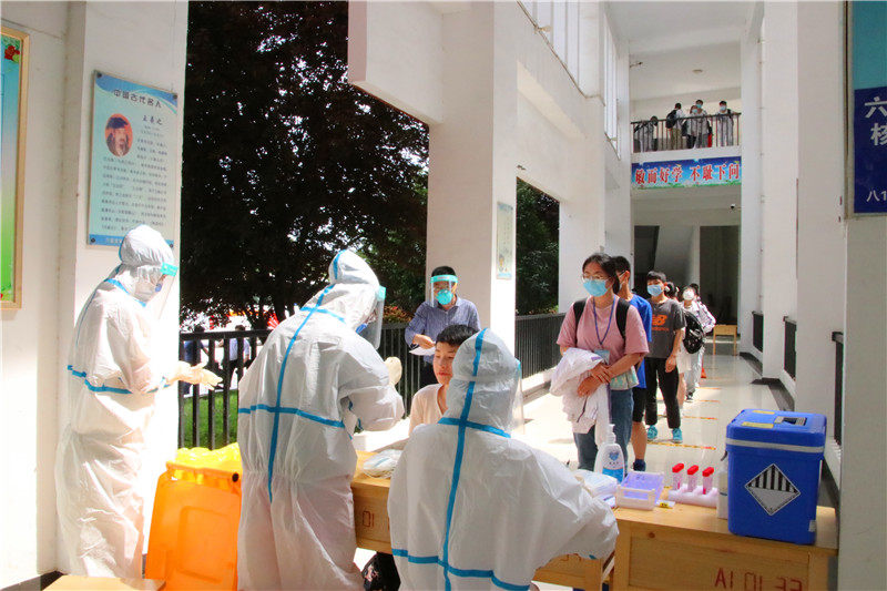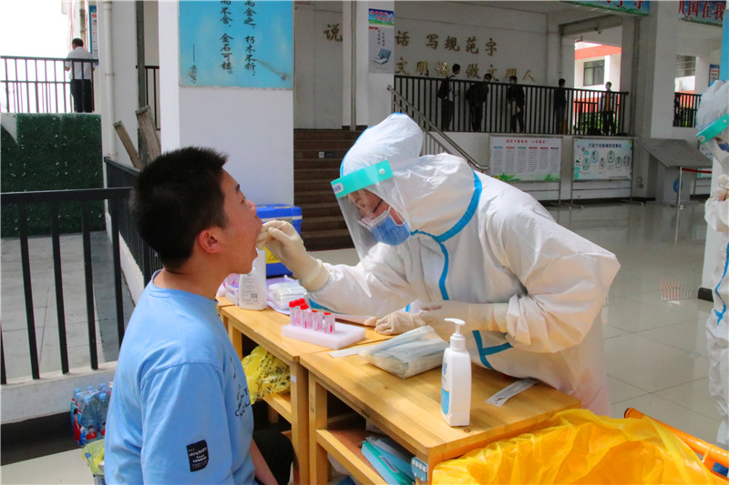 为提高工作效率,确保检测工作顺利开展,学校专题召开核酸检测工作培训会,精心组织,制定预案,细化流程,从核酸采样到后勤保障分工明确,将七、八、九年级划分为三个区域,其中包含7个学生检测点和1个教职工检测点。每个点位分别设置等候区、排队区及采样区。根据名单,十人一组,按照防疫要求保持安全间隔距离,依次进行采样。采样现场实行单口进入、单口离开,人员不交叉。采样结束后,师生迅速离开测试场地。在检测过程中,全体师生佩戴口罩,按时到位,自觉按照间隔一米的距离排队,整个流程操作规范,采样工作有序进行。三个小时内,学校顺利完成5000余名师生的核酸检测采样工作,充分展现了九中速度,交上了一份疫情防控的满意答卷。