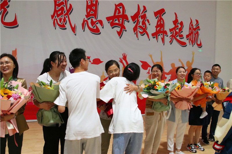 一场有学生、家长和老师共同演绎的原创诗朗诵《我们毕业啦》在典礼现场闪亮登场。孩子们自发地向家长和老师送上了一捧捧鲜花,深情地拥在老师的怀中。三年来,他们一起陪伴,相互支持,共同成长,书写了一曲新时代家校合作的绚丽篇章。