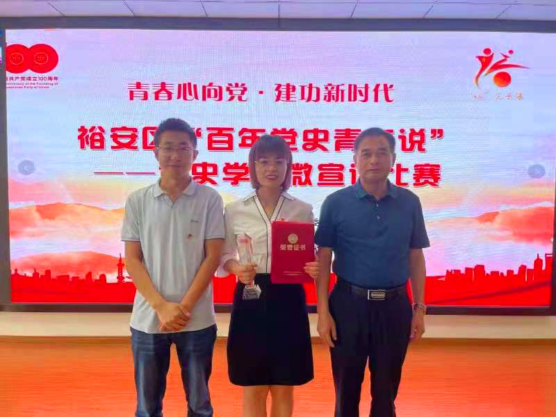 为隆重庆祝中国共产党成立100周年,扎实开展“学党史、强信念、跟党走”青少年党史学习教育,中共六安市裕安区委宣传部、共青团六安市裕安区委员会共同举办了“百年党史青年说”——党史学习微宣讲比赛。 在6月19日下午的决赛中,我校苏娟娟老师从二十多位选手中脱颖而出,荣获一等奖。