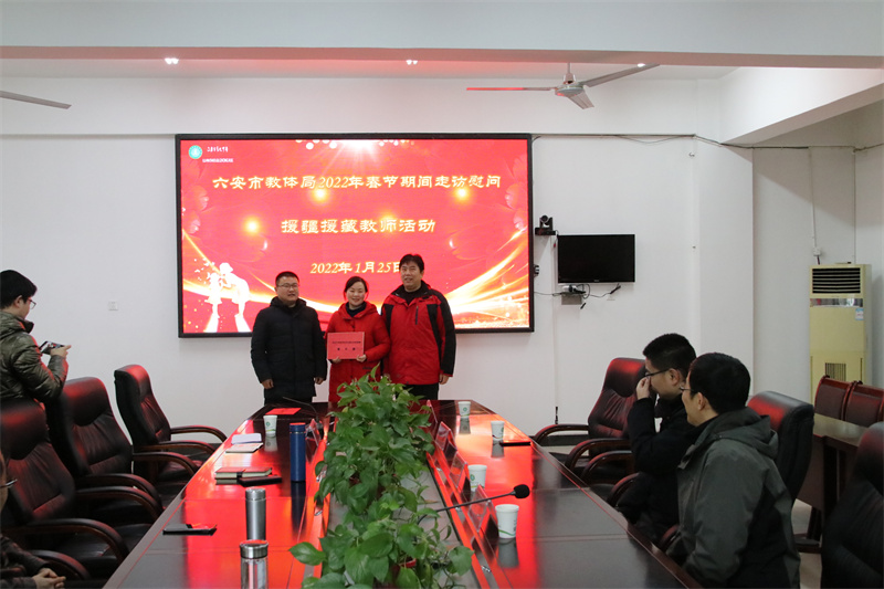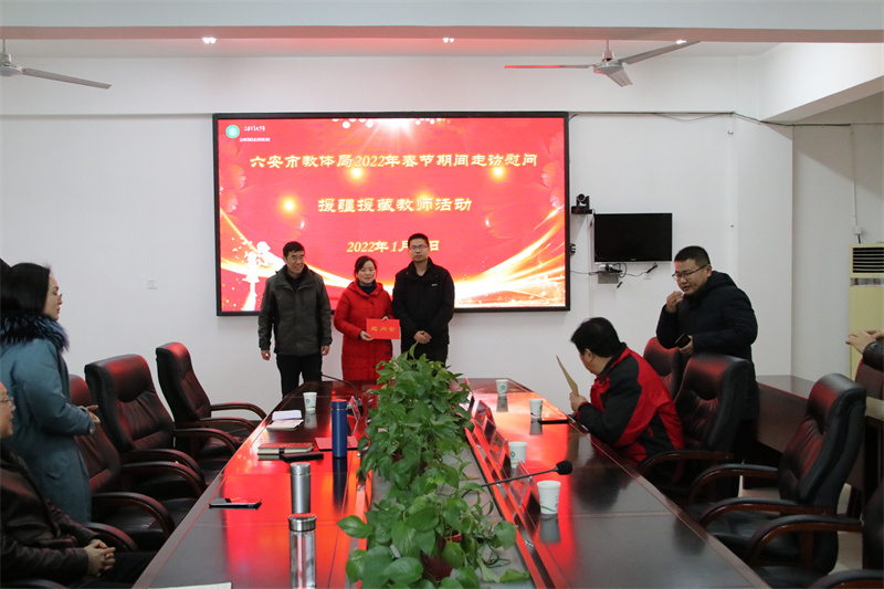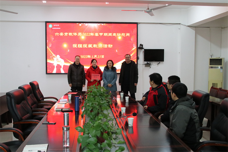 春节将至,岁寒情暖。1月25日上午,市教体局副总督学、督导室主任龚改,市教体局督导室副主任高松,区委教育工委副书记、区教体局副局长郭杰,区教体局人事股副股长郑灿灿一行莅临六安九中看望慰问学校援疆教师付应丽老师,向她致以真诚的问候,并送上慰问金。