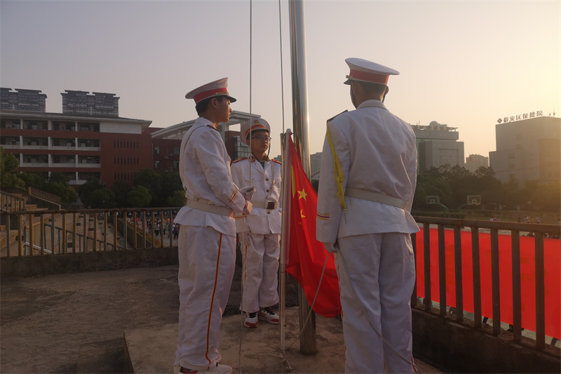 9月19日早晨7点整,国旗护卫队队员昂首挺胸,齐步迈向升旗台。伴随着雄壮激昂的《义勇军进行曲》,鲜艳的五星红旗冉冉升起,全体师生面向国旗,齐唱国歌,行注目礼。