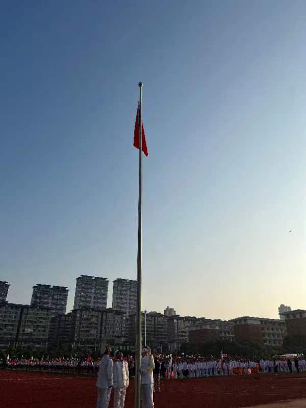 彩旗飘飘,鼓乐阵阵。九中师生,整装列队。迎着胜似春朝的秋阳,伴着激越昂扬的《义勇军进行曲》,五星红旗冉冉升起。全体起立,高唱国歌。震彻校园的歌声,彰显着九中师生坚定不移的信念、心之所向的理想、孜孜不倦的追求和青春无畏的光芒。