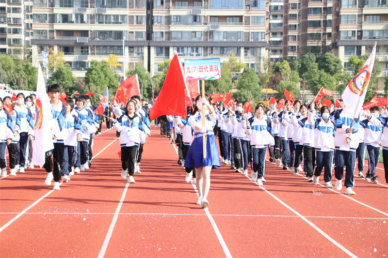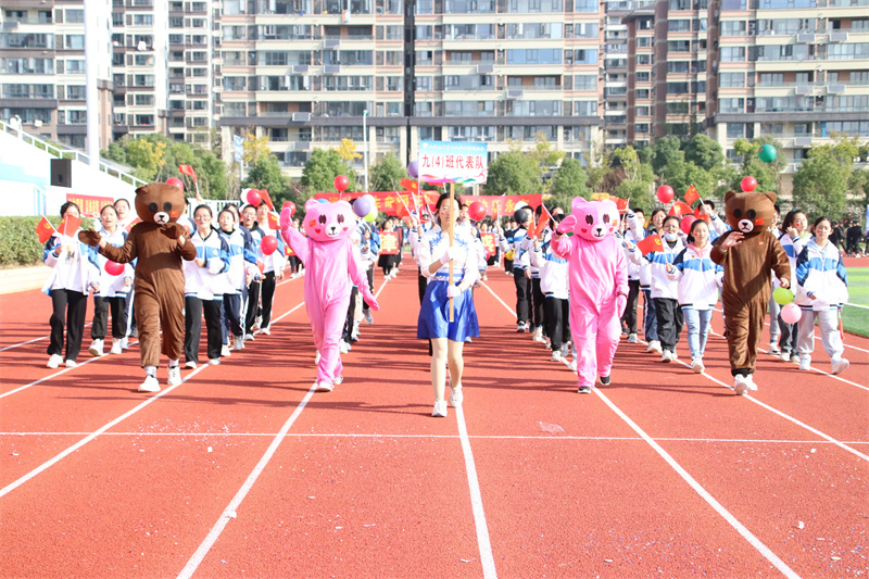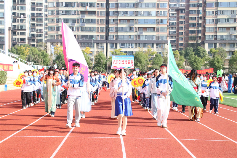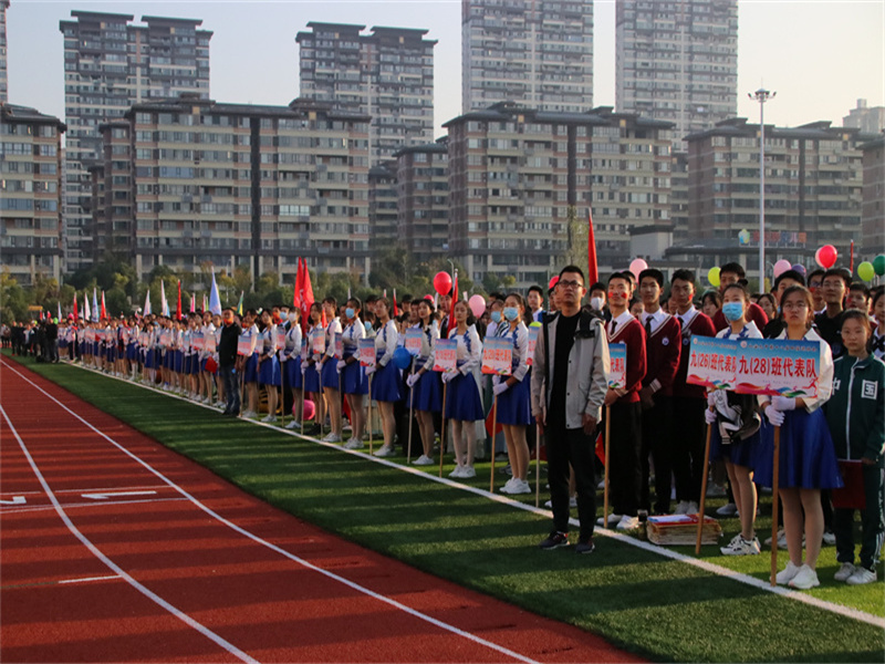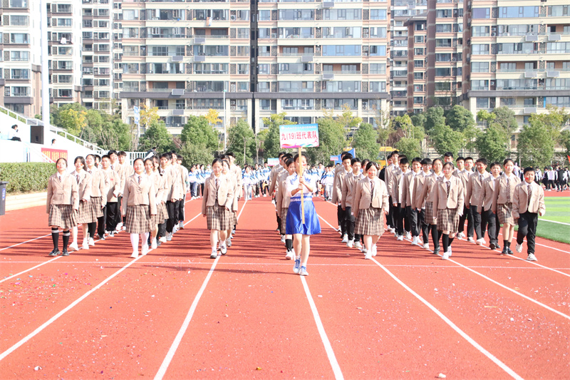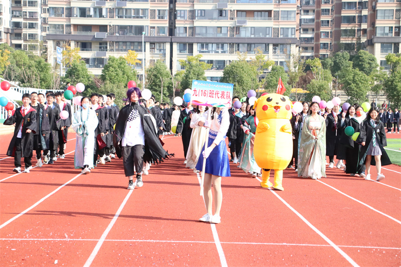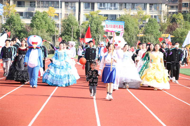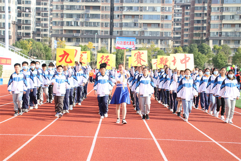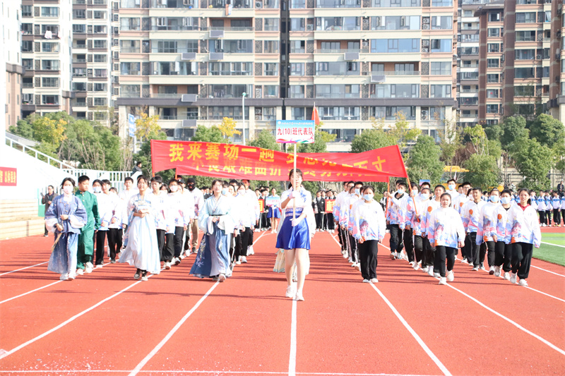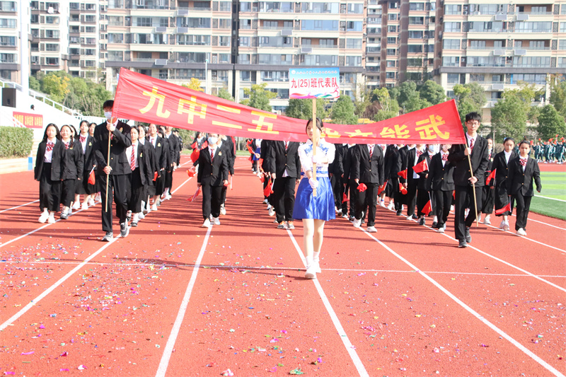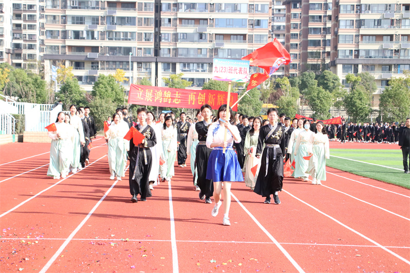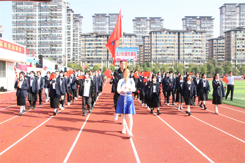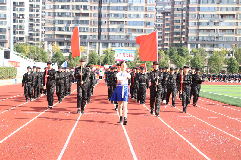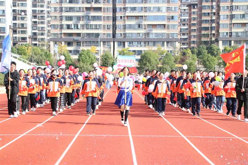 伴随着轻快的《运动员进行曲》,国旗、校徽、会徽、花环、红旗方阵迈着矫健的步伐依次进场。各班方阵由班主任带领,踏着整齐的步伐,喊着响亮的口号,无不展示着朝气蓬勃、健康向上的精神风貌。各班级逐一在主席台前亮相,充分展现了九中学子独具慧心的无限创意和朝气蓬勃的青春风采。街舞、羽扇秀、健身操,形式多样;汉服、运动服、玩偶服,个性十足;传统文化、运动健身、强国复兴,主题纷呈。