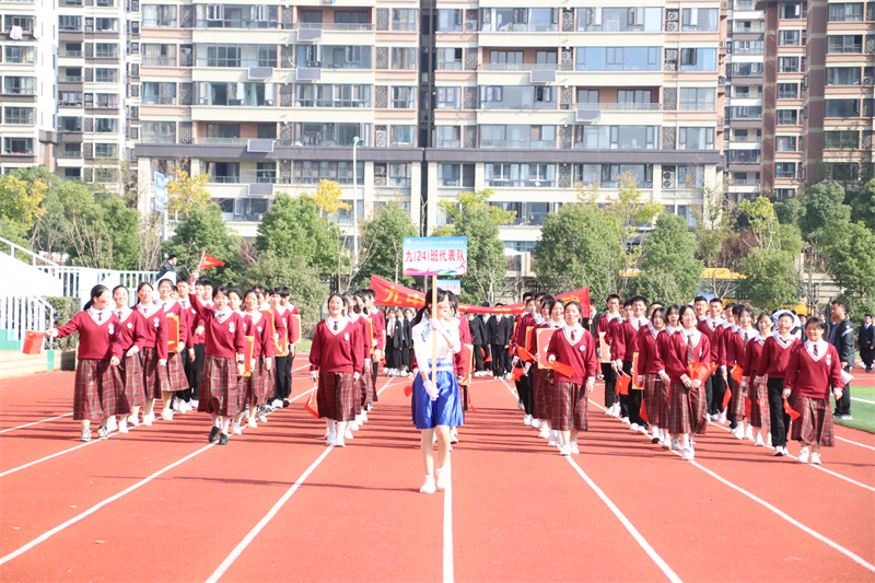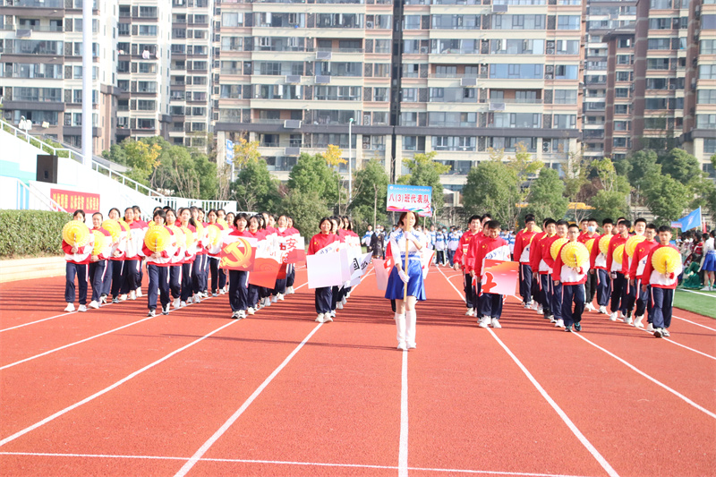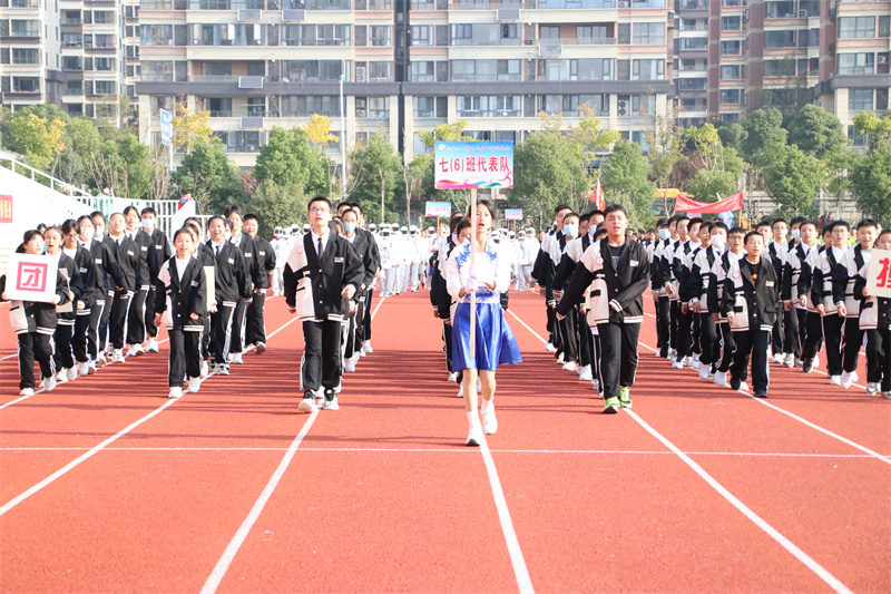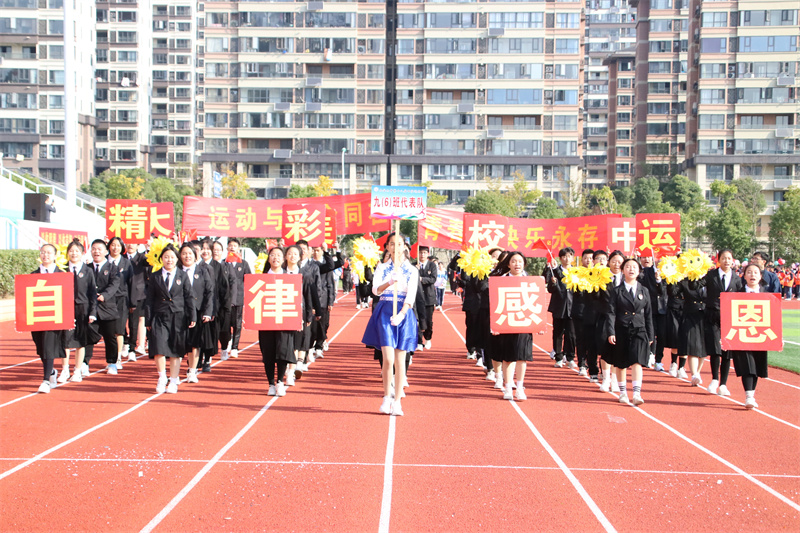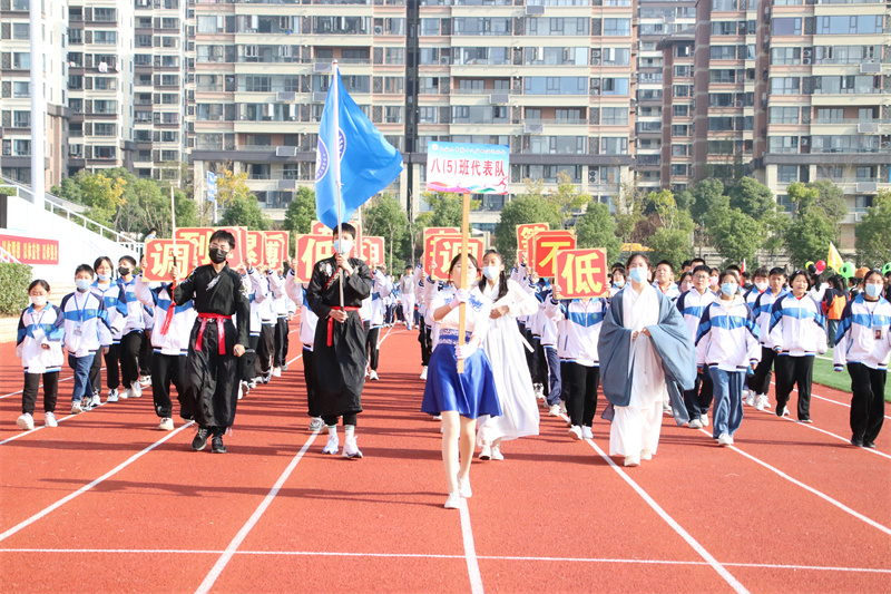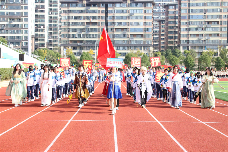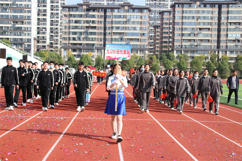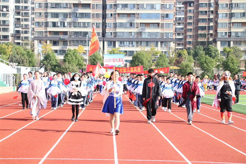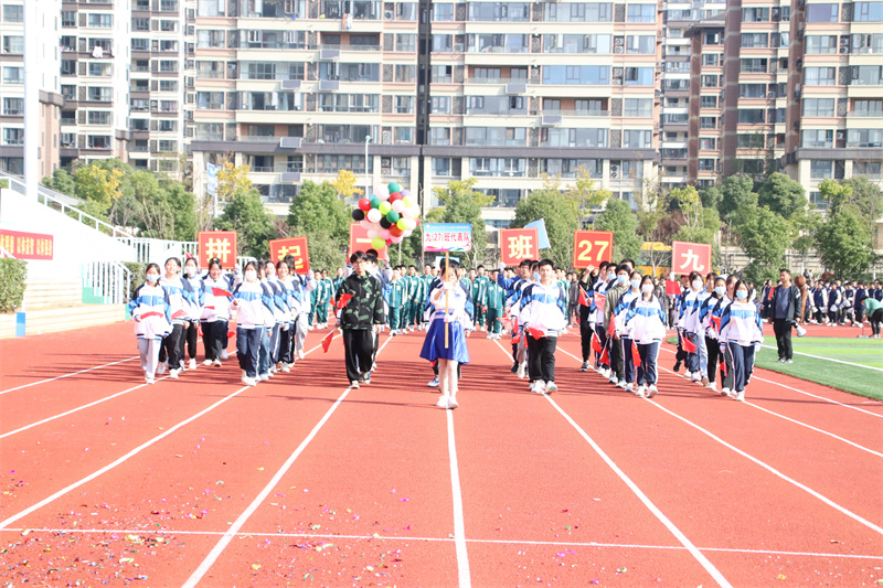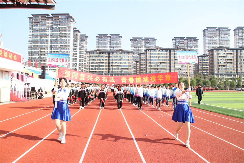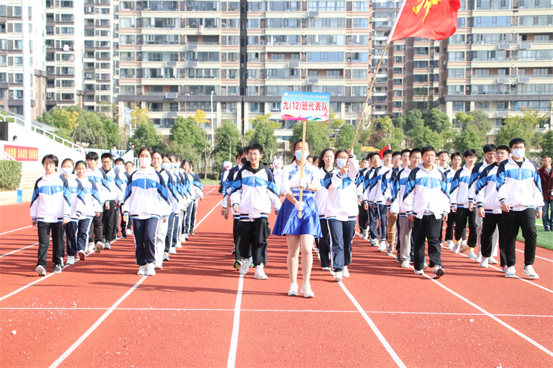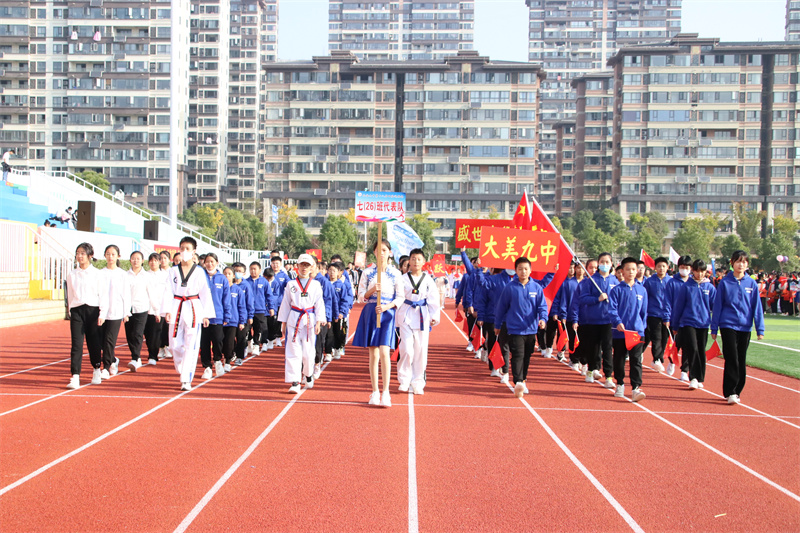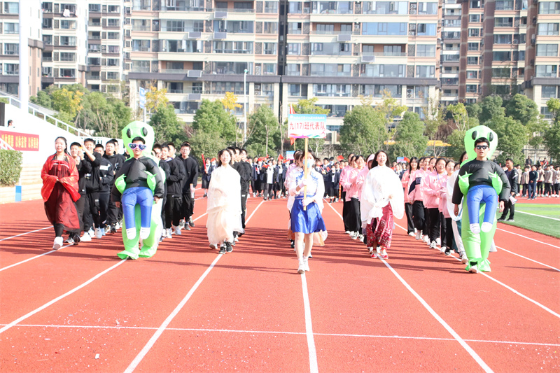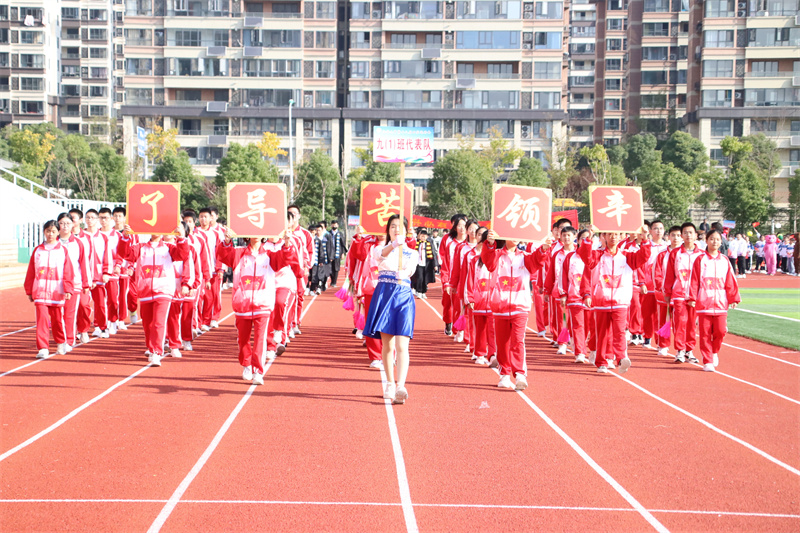 伴随着轻快的《运动员进行曲》,国旗、校徽、会徽、花环、红旗方阵迈着矫健的步伐依次进场。各班方阵由班主任带领,踏着整齐的步伐,喊着响亮的口号,无不展示着朝气蓬勃、健康向上的精神风貌。各班级逐一在主席台前亮相,充分展现了九中学子独具慧心的无限创意和朝气蓬勃的青春风采。街舞、羽扇秀、健身操,形式多样;汉服、运动服、玩偶服,个性十足;传统文化、运动健身、强国复兴,主题纷呈。