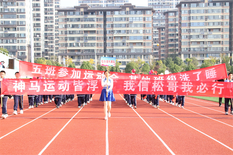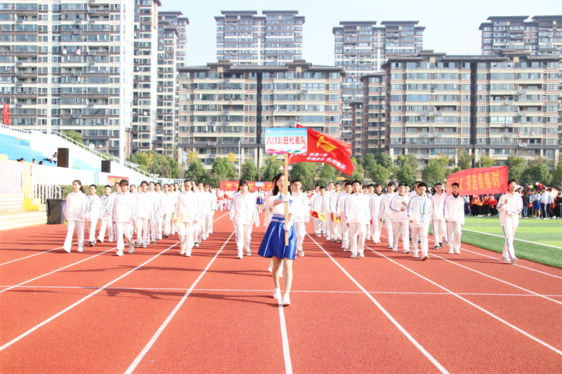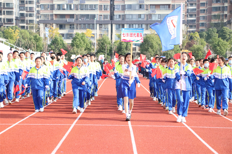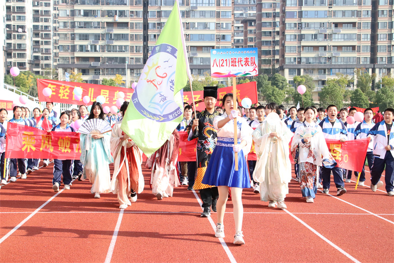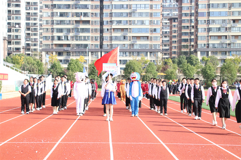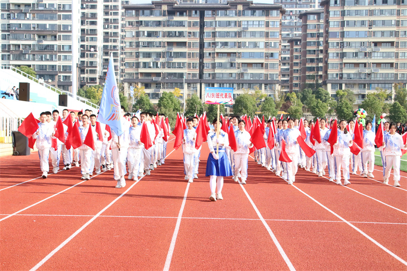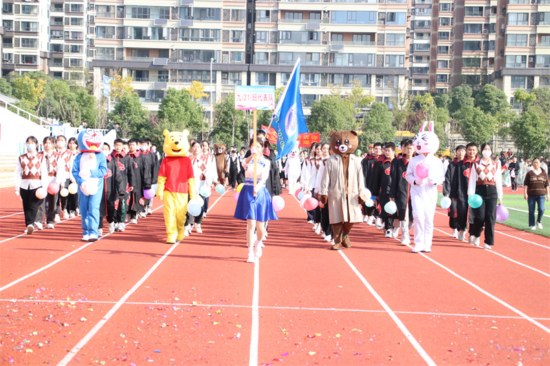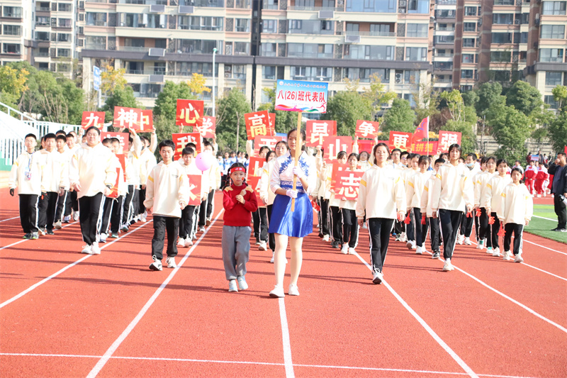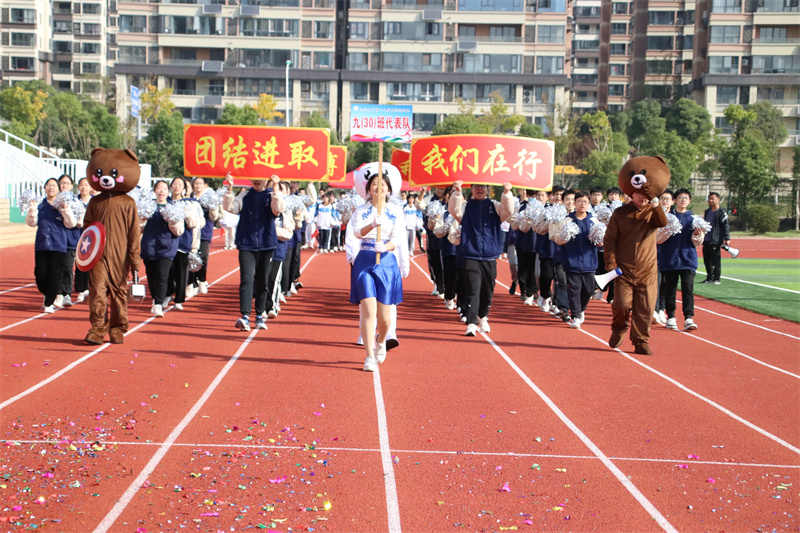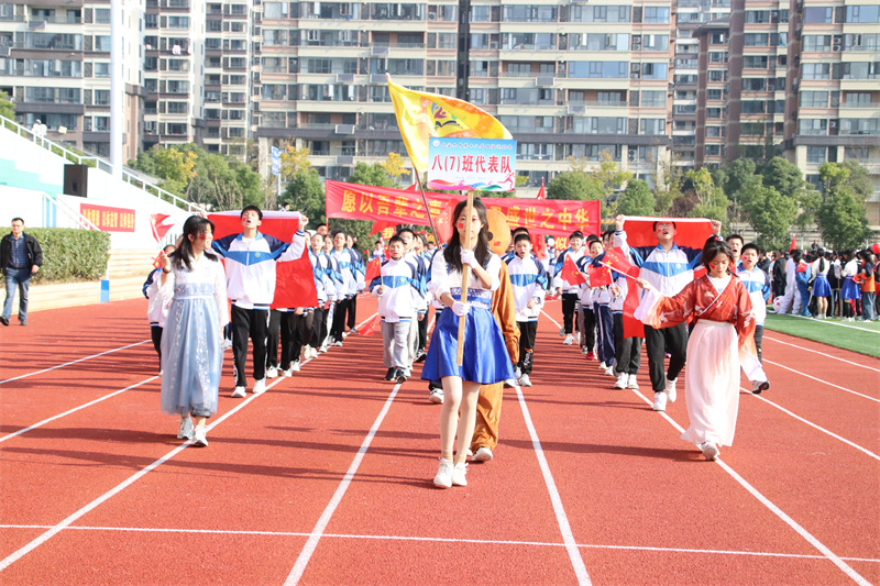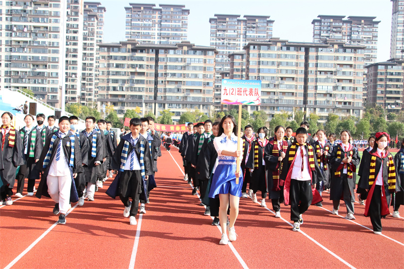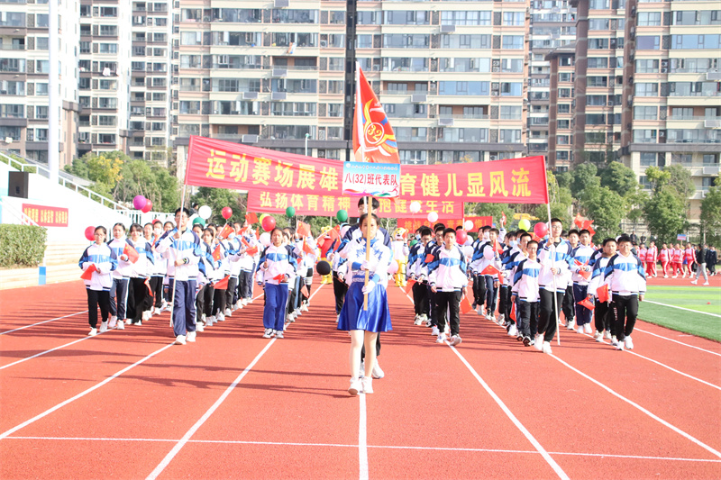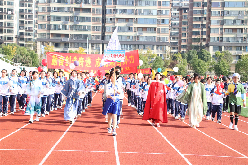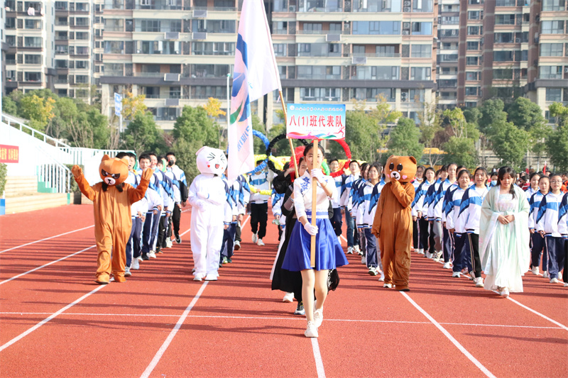 伴随着轻快的《运动员进行曲》,国旗、校徽、会徽、花环、红旗方阵迈着矫健的步伐依次进场。各班方阵由班主任带领,踏着整齐的步伐,喊着响亮的口号,无不展示着朝气蓬勃、健康向上的精神风貌。各班级逐一在主席台前亮相,充分展现了九中学子独具慧心的无限创意和朝气蓬勃的青春风采。街舞、羽扇秀、健身操,形式多样;汉服、运动服、玩偶服,个性十足;传统文化、运动健身、强国复兴,主题纷呈。