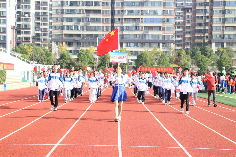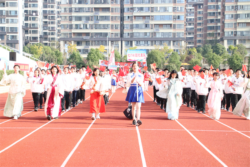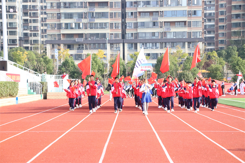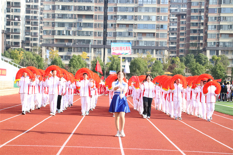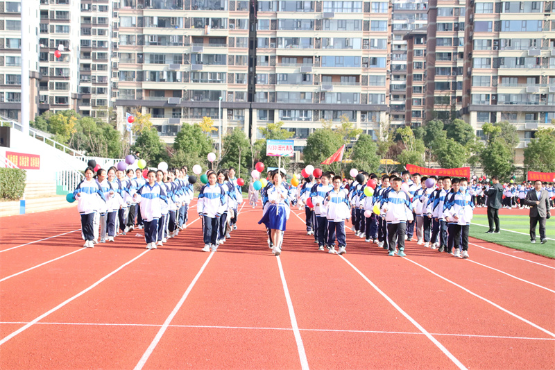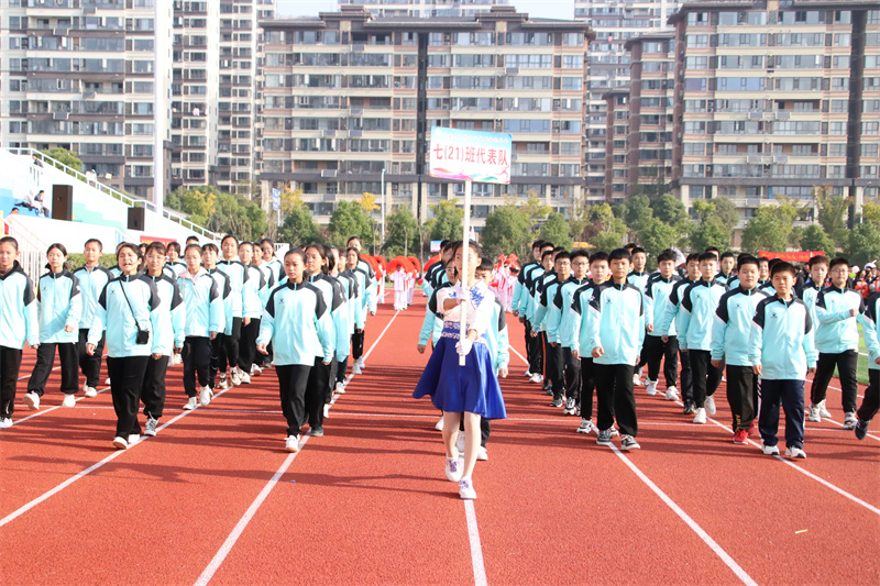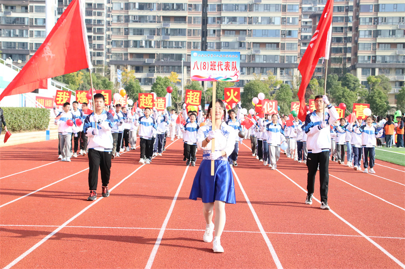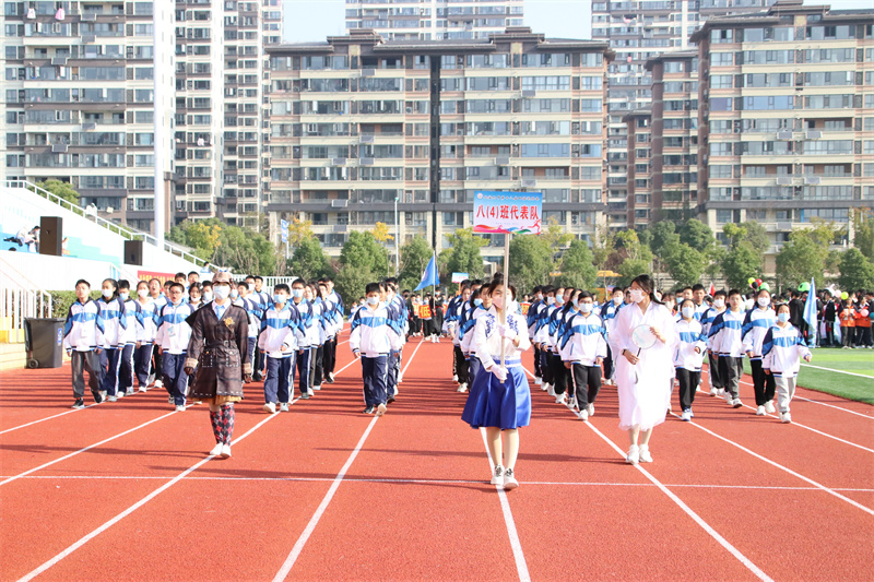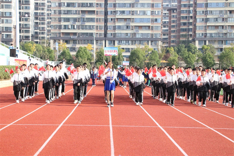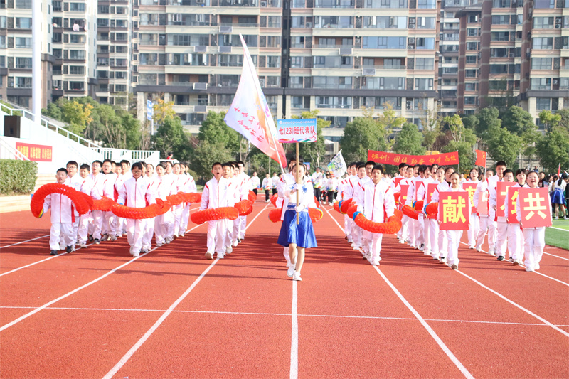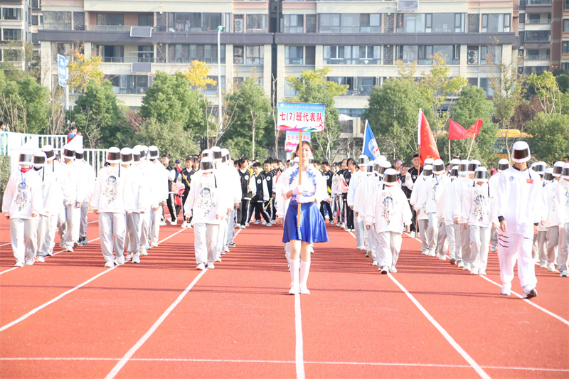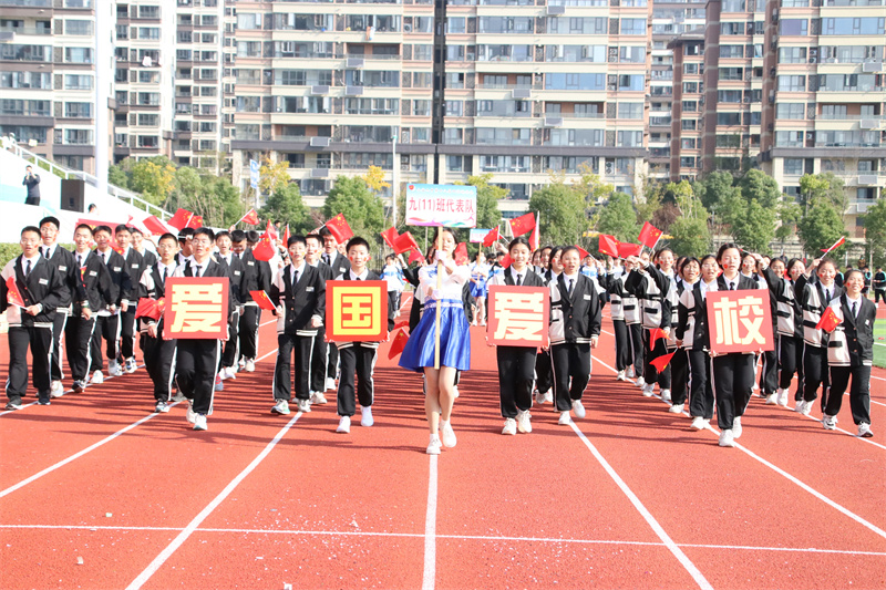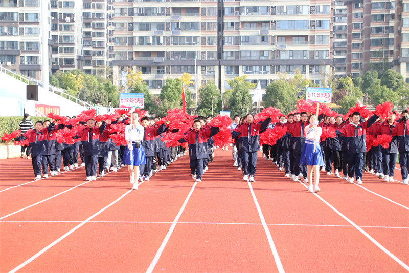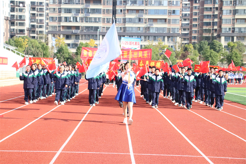 伴随着轻快的《运动员进行曲》,国旗、校徽、会徽、花环、红旗方阵迈着矫健的步伐依次进场。各班方阵由班主任带领,踏着整齐的步伐,喊着响亮的口号,无不展示着朝气蓬勃、健康向上的精神风貌。各班级逐一在主席台前亮相,充分展现了九中学子独具慧心的无限创意和朝气蓬勃的青春风采。街舞、羽扇秀、健身操,形式多样;汉服、运动服、玩偶服,个性十足;传统文化、运动健身、强国复兴,主题纷呈。