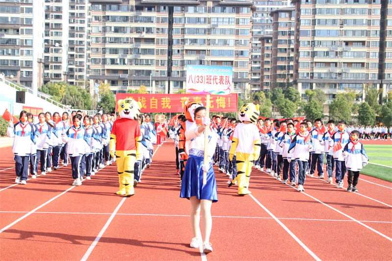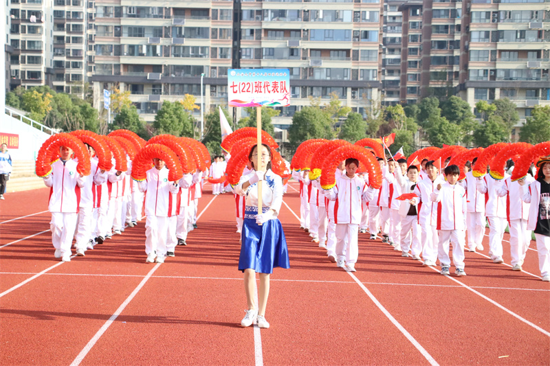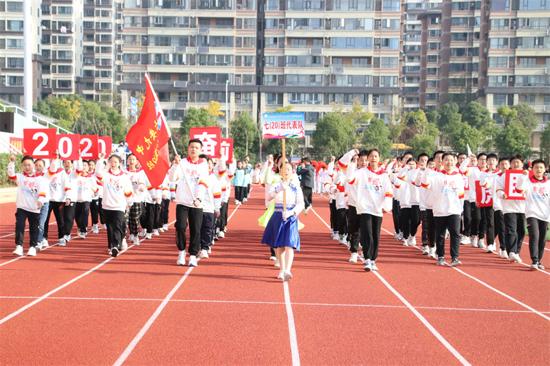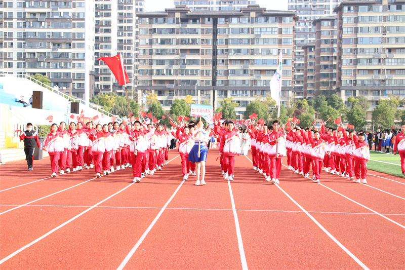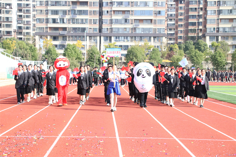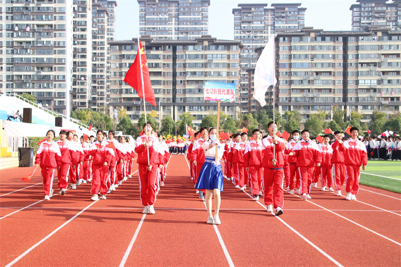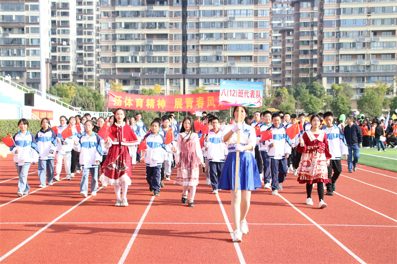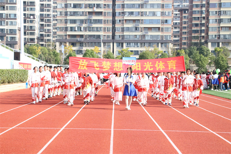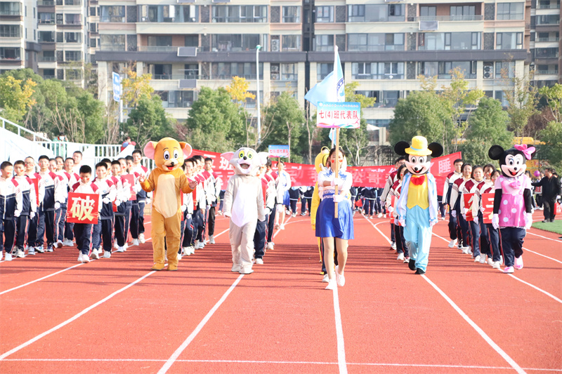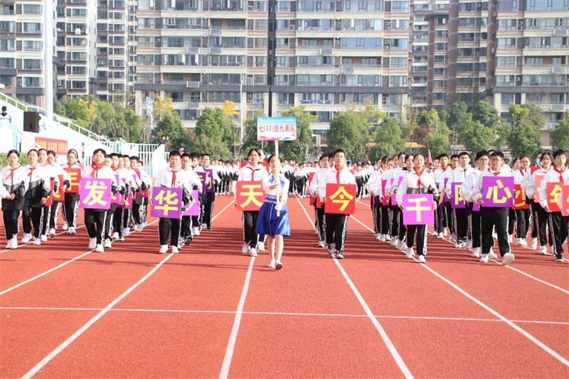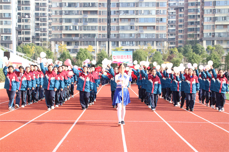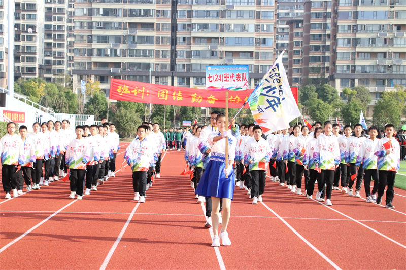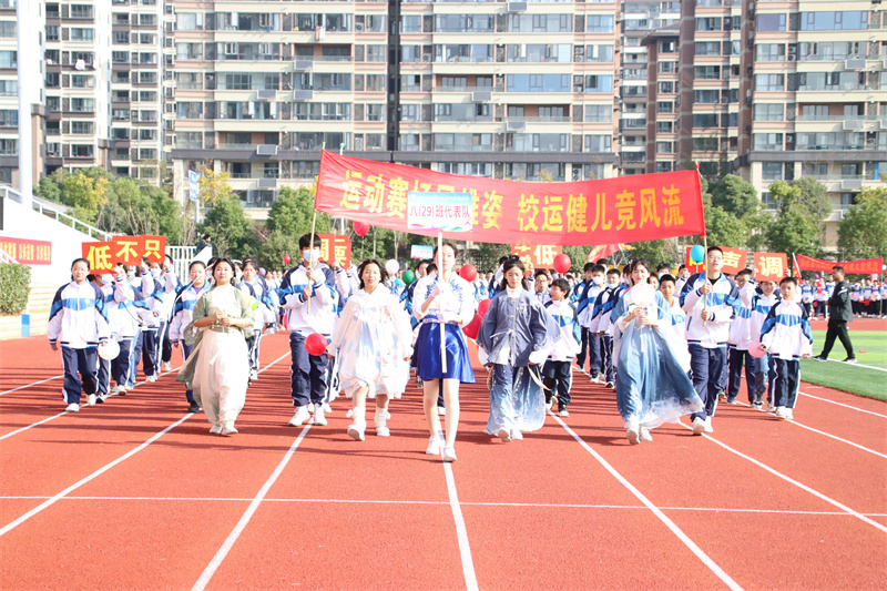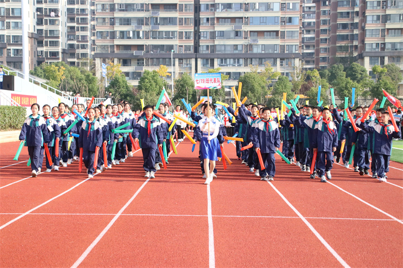 伴随着轻快的《运动员进行曲》,国旗、校徽、会徽、花环、红旗方阵迈着矫健的步伐依次进场。各班方阵由班主任带领,踏着整齐的步伐,喊着响亮的口号,无不展示着朝气蓬勃、健康向上的精神风貌。各班级逐一在主席台前亮相,充分展现了九中学子独具慧心的无限创意和朝气蓬勃的青春风采。街舞、羽扇秀、健身操,形式多样;汉服、运动服、玩偶服,个性十足;传统文化、运动健身、强国复兴,主题纷呈。