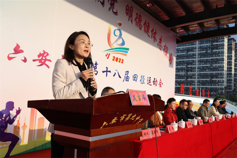 六安九中校长李艳在开幕式上致辞。本届运动以“青春飞扬心向党,明德健体志报国”,旨在告诉全体师生,接过了以中国式现代化全面推进中华民族伟大复兴这一历史的接力棒,就要坚定不移听党话、跟党走,怀抱梦想又脚踏实地,敢想敢为又善作善成,立志做有理想、敢担当、能吃苦、肯奋斗的新时代堪当大任者,让青春在全面建设社会主义现代化国家的火热实践中绽放绚丽之花,为实现中华民族伟大复兴贡献更加强劲的力量。李艳希望广大师生:以体明德,做一名品德高尚的强国人;以体强身,做一名体质健硕的强国人;以体立志,做一名胸怀家国的强国人。